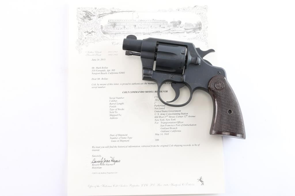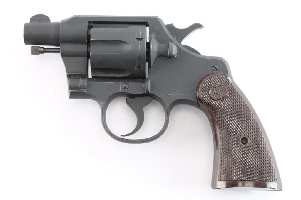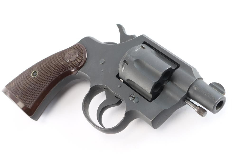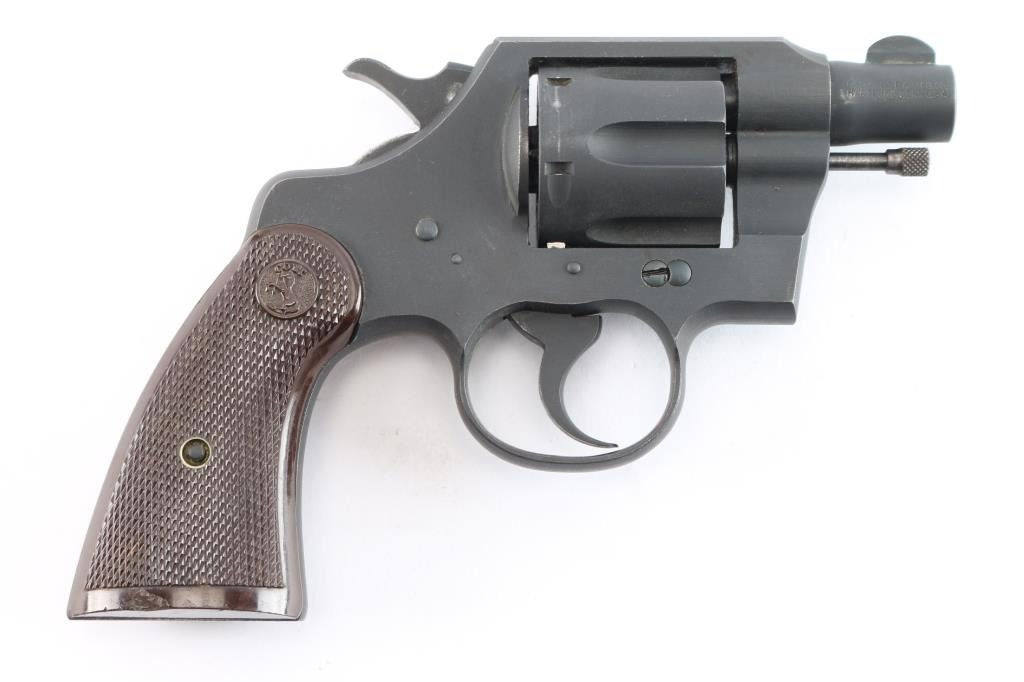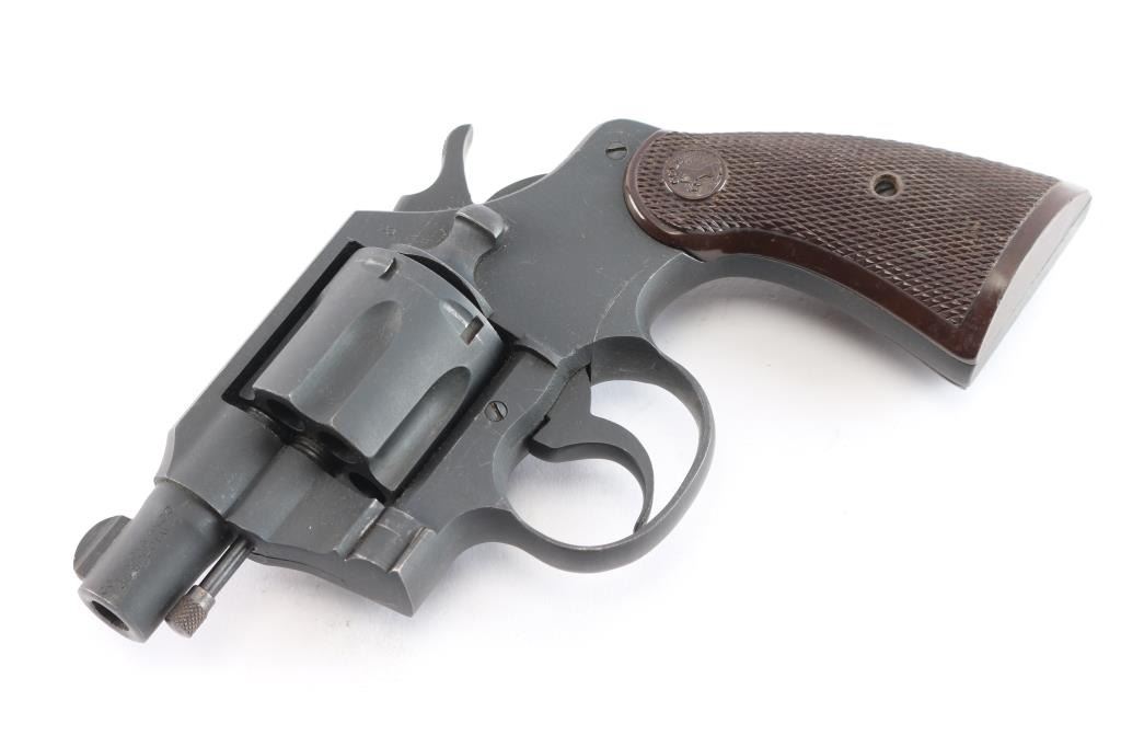 'USGI' American made WII era double-action revolver chambered in .38 Special, manufactured circa 1943 in Hartford, CT. Approximately 50,000 of these revolvers were manufactured between 1942-1945 for use in Word War II. Revolver features a less common 2" barrel, round blade front sight, square notched frame rear sight, non-shrouded ejector rod, knurled ejector rod head, fluted six-shot cylinder, smooth curved trigger, checkered hammer spur, and two-piece checkered brown plastic grips with Rampant Colt motif. Small flaming bomb proof is above the cylinder latch on the left side, and the rampant colt logo is not present. The original parkerized finish retained is aproximately 95% with light scattered scratches, some edge wear, and a drag line on the cylinder. Metal displays no rust, or deformation. Grips are very good with a chip out of the bottom edge of the right grip panel. Action is smooth and crisp with a solid lock-up. The bore is excellent with strong rifling, and cylinders are also excellent. The chambers and bore need to be cleaned. Revolver includes a Colt letter of authenticity.