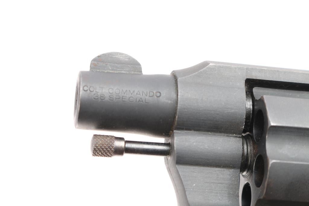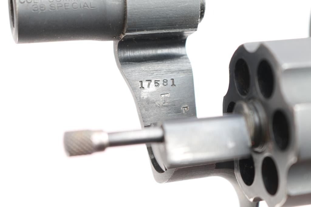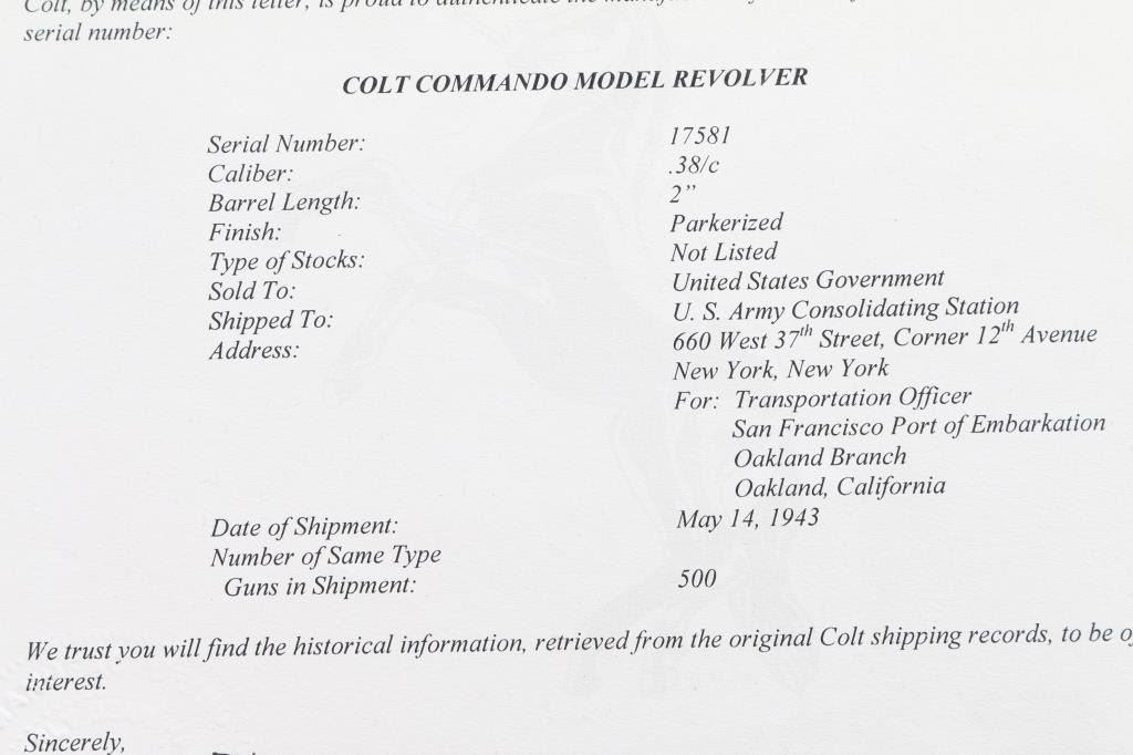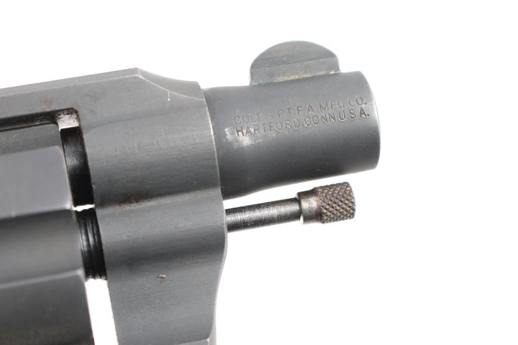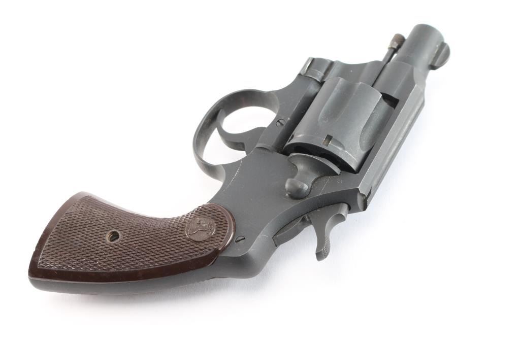 'USGI' American made WII era double-action revolver chambered in .38 Special, manufactured circa 1943 in Hartford, CT. Approximately 50,000 of these revolvers were manufactured between 1942-1945 for use in Word War II. Revolver features a less common 2" barrel, round blade front sight, square notched frame rear sight, non-shrouded ejector rod, knurled ejector rod head, fluted six-shot cylinder, smooth curved trigger, checkered hammer spur, and two-piece checkered brown plastic grips with Rampant Colt motif. Small flaming bomb proof is above the cylinder latch on the left side, and the rampant colt logo is not present. The original parkerized finish retained is aproximately 95% with light scattered scratches, some edge wear, and a drag line on the cylinder. Metal displays no rust, or deformation. Grips are very good with a chip out of the bottom edge of the right grip panel. Action is smooth and crisp with a solid lock-up. The bore is excellent with strong rifling, and cylinders are also excellent. The chambers and bore need to be cleaned. Revolver includes a Colt letter of authenticity.