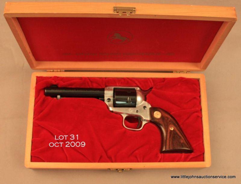 Colt Commemorative Frontier Scout SAA revolver, Arkansas Territory Sesquicentennial (1819-1969), .22LR cal., 4-3/4" barrel, blue and stainless steel finish, smooth wood Colt medallion grips, #1204ARK. This gun is in near mint condition inits original lined factory wood display case that is in excellent condition. Est.: $350-$550.