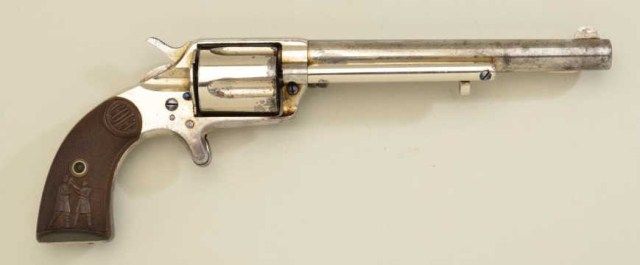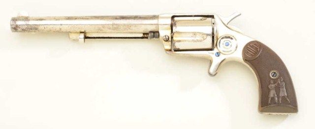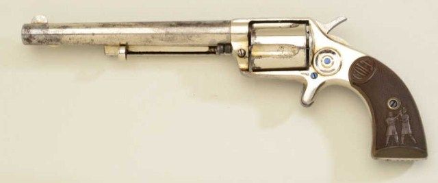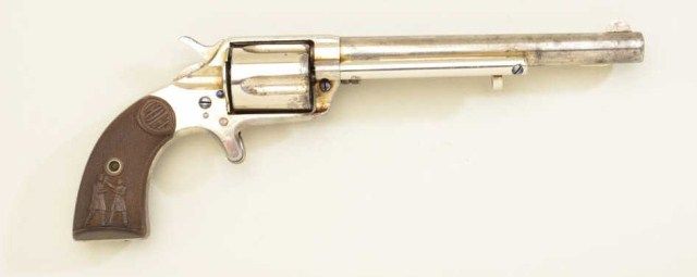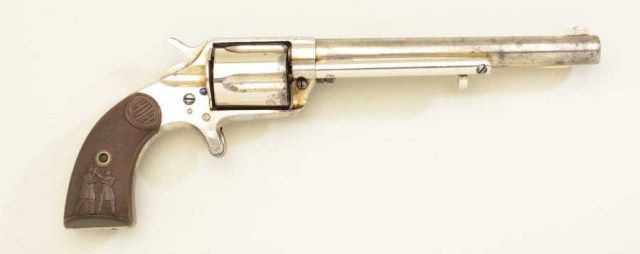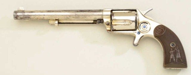 Colt Cop and Thug or New Police .38 caliber center fire single action revolver, nickel plated, hard rubber grips with Cop and Thug scene showing scarce 6” barrel. Factory letter confirms configuration and notes thatit was shipped to Charles H. Turnbull, March 10, 1883, with one gun in shipment. The Turnbull name is well-known in Hartford, CT. and he may have had connections with the Colt factory or Hartford politics. The pistolremains in very good condition with approx. 60-80% original nickel that is evenly drifting and toning and some light pitting and erosion starting in the areas where the nickel is lost. The New Police etching islight but mostly visible. The edges are sharp and the grips are very good + with sharp detail and slight fading. The small parts and screws show bright original fire blue. The markings are good, the action is good and the bore is good. A far above average Cop and Thug with scarce barrel length and researchable history as to one gun shipment denoting special order. Est.: $2,500-$5,000.