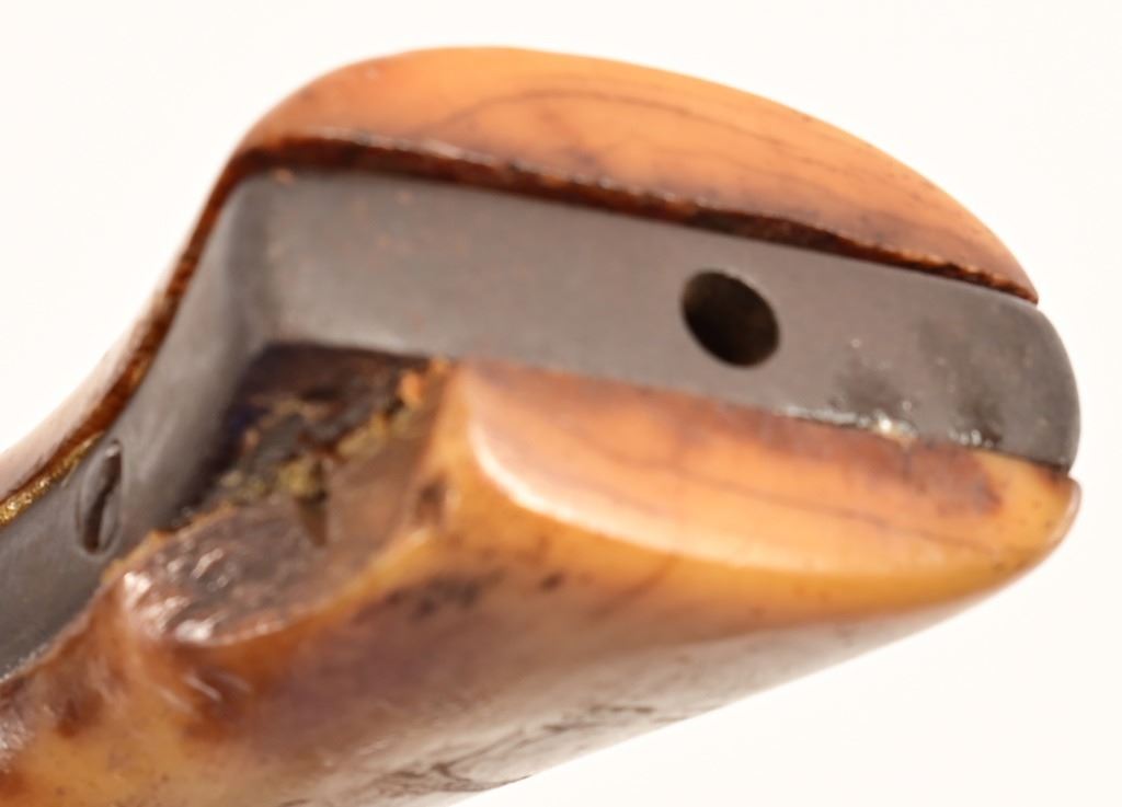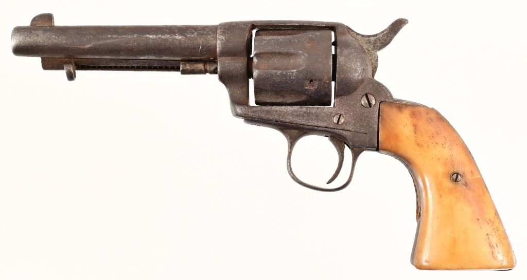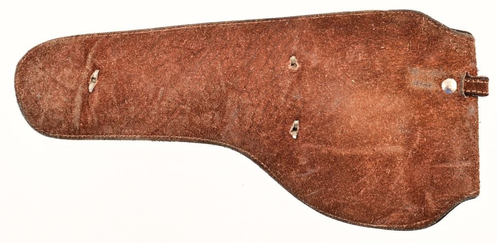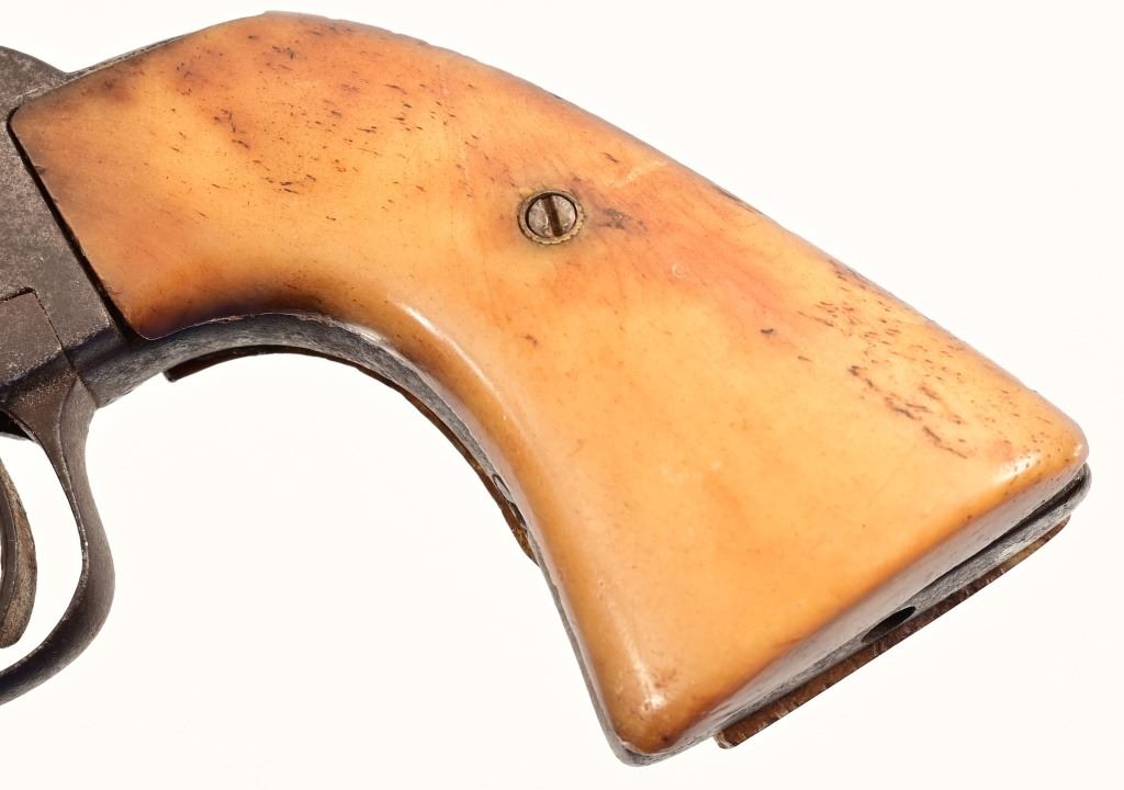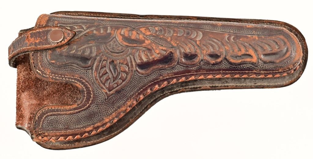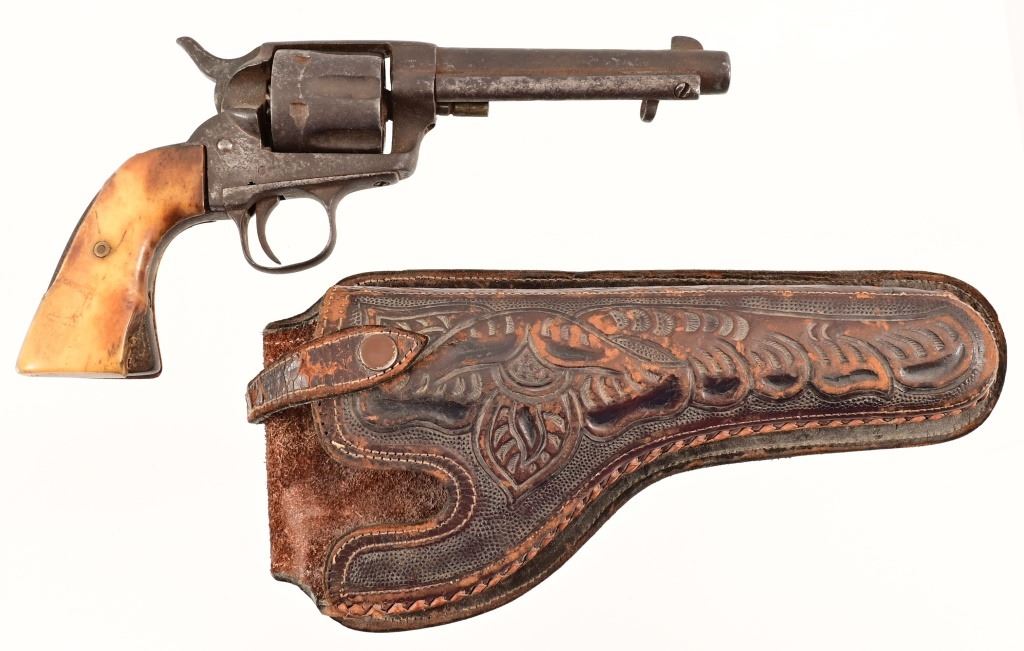 Ivory grips, 4.5" holster. With tooled leather holster. Serial number 912