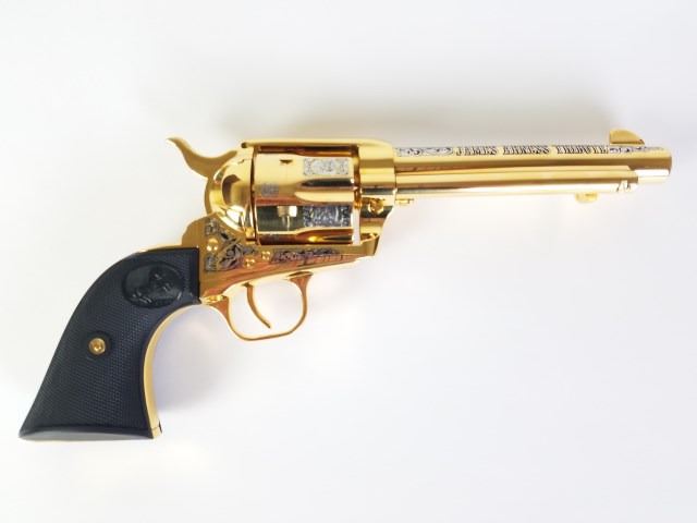 gold plate engraved by A&A #38 of 250. James Arness Tribute on both sides of barrel, scroll engraving, James Arness images on cylinder and frame, Rampant Colt hard rubber grips, as new with only slight drag marks. Modern. Est. 2500-3500