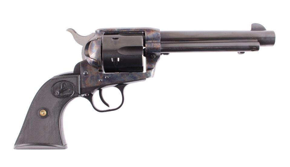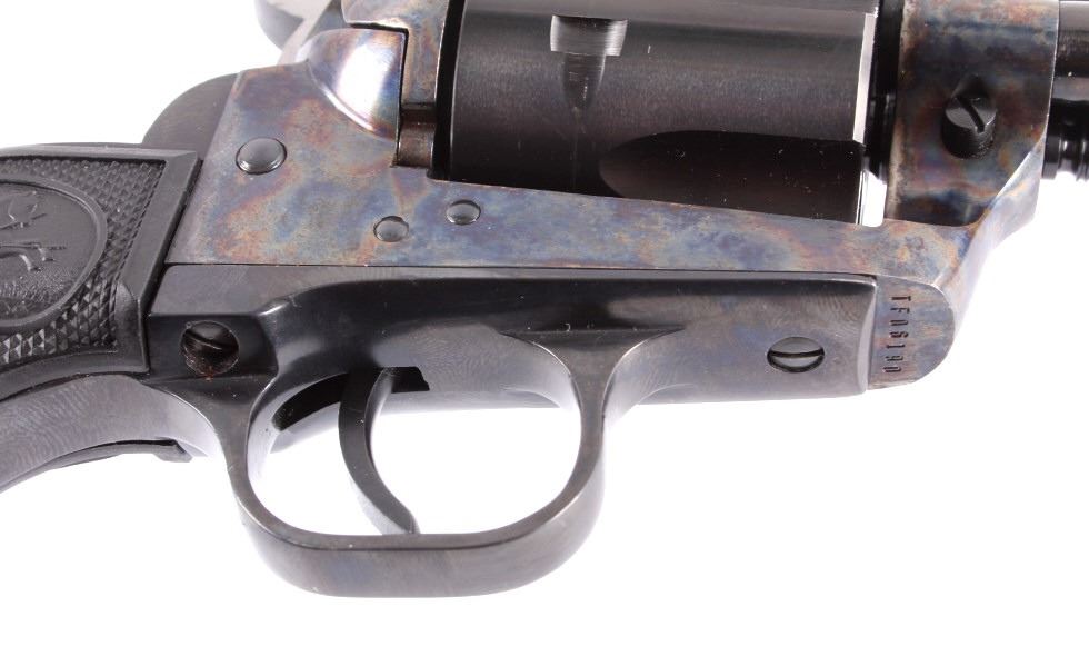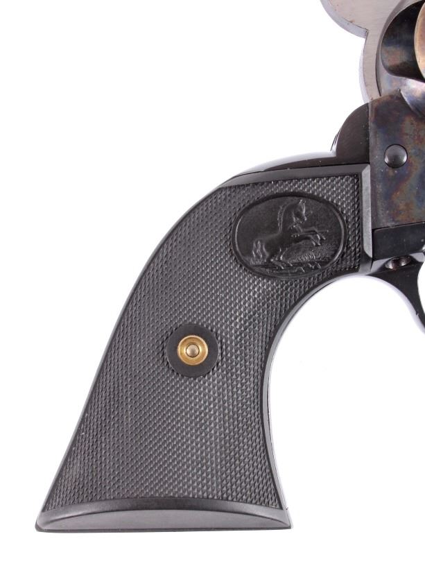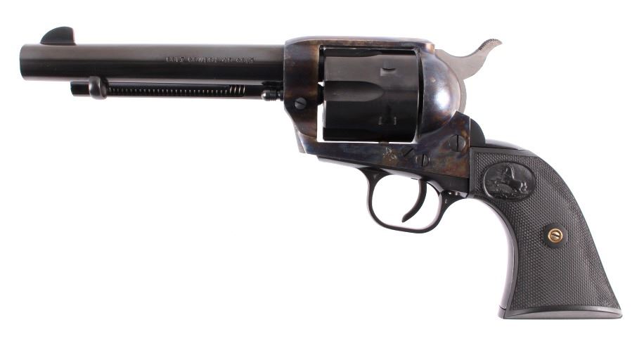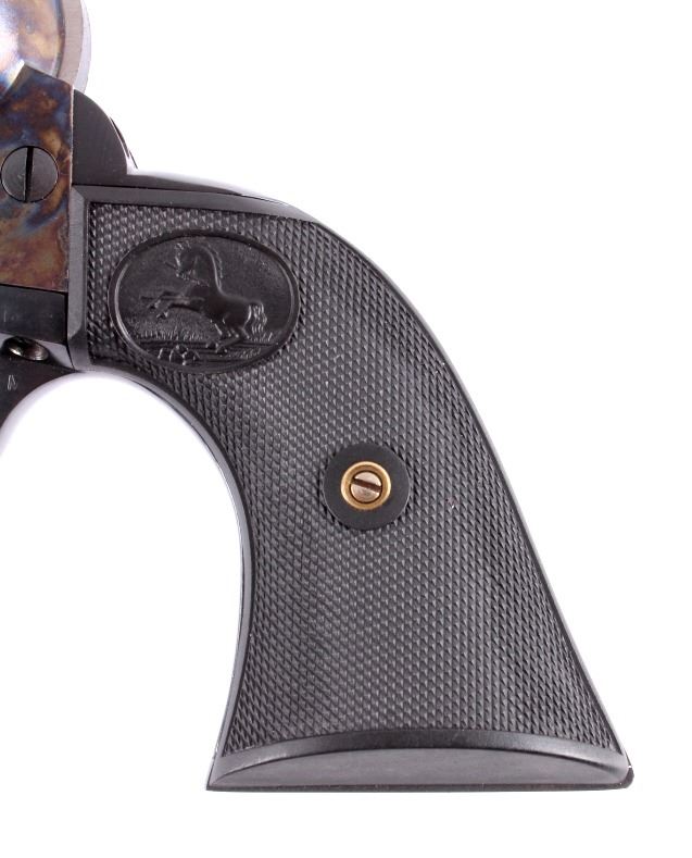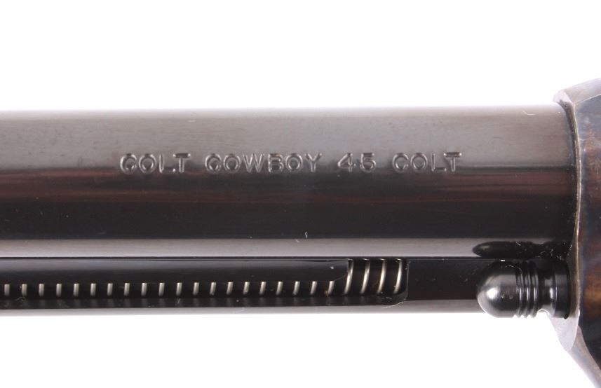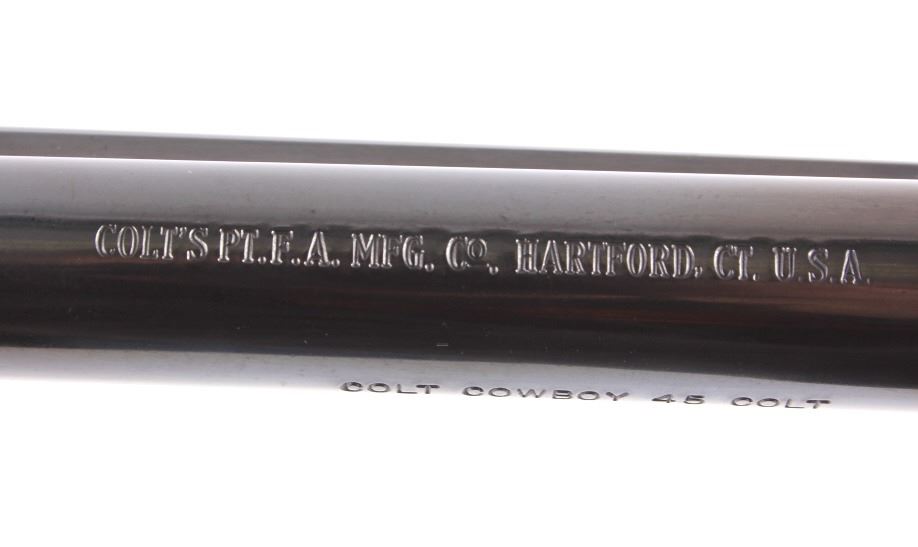 This is an exceptional Colt Cowboy single action revolver chambered in the .45 Colt caliber. The revolver shows a beautifully toned case hardened frame with a blued 5.5" barrel and grip frame. The barrel is marked "Colt Cowboy 45 Colt" and "Colt's Pt. F.A. Mfg. Co. Hartford, Conn. U.S.A.". The checkered grips show the Rampant Colt emblem on both sides. The Colt Cowboy shows very good, near new condition with 98%+ bluing and finish. The revolver measures 11" with a 5.5" barrel. Serial number is TF08190. This is a modern manufactured handgun and requires an FFL or NICS background check.