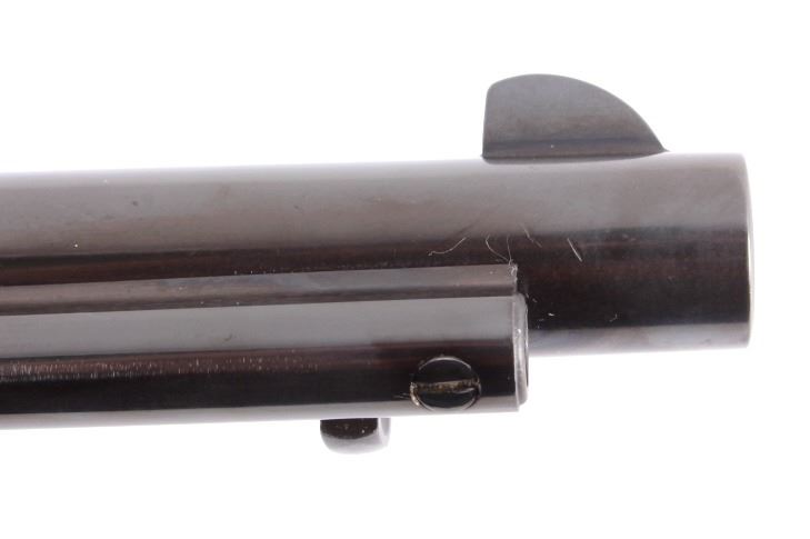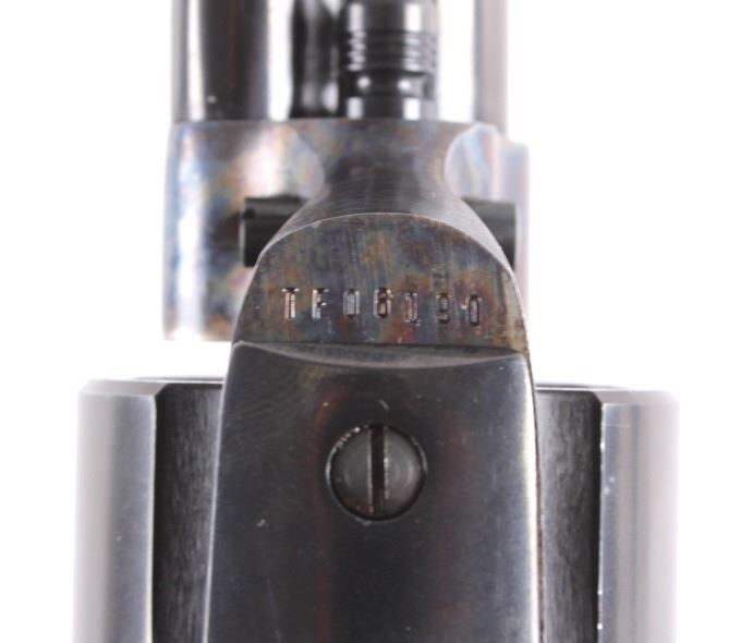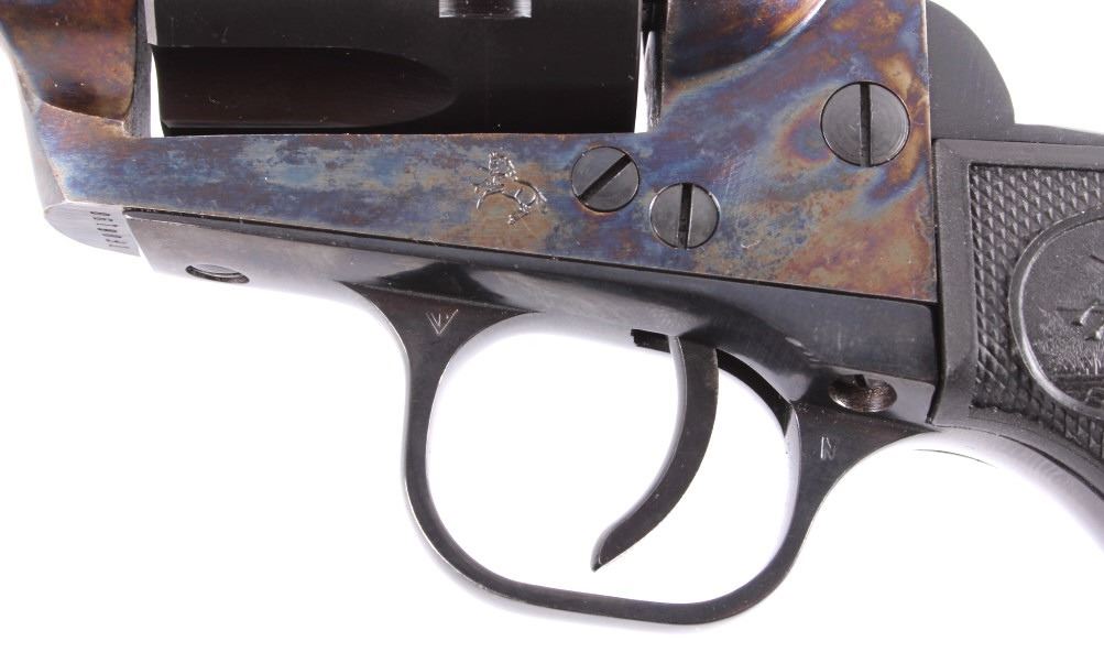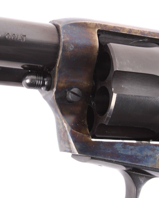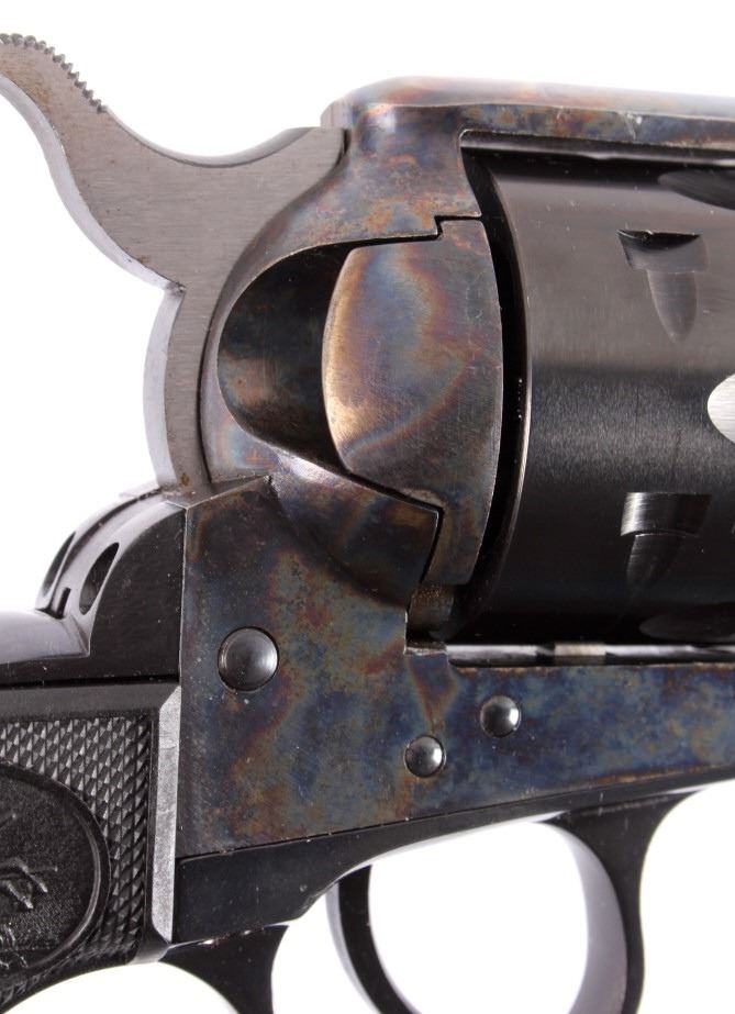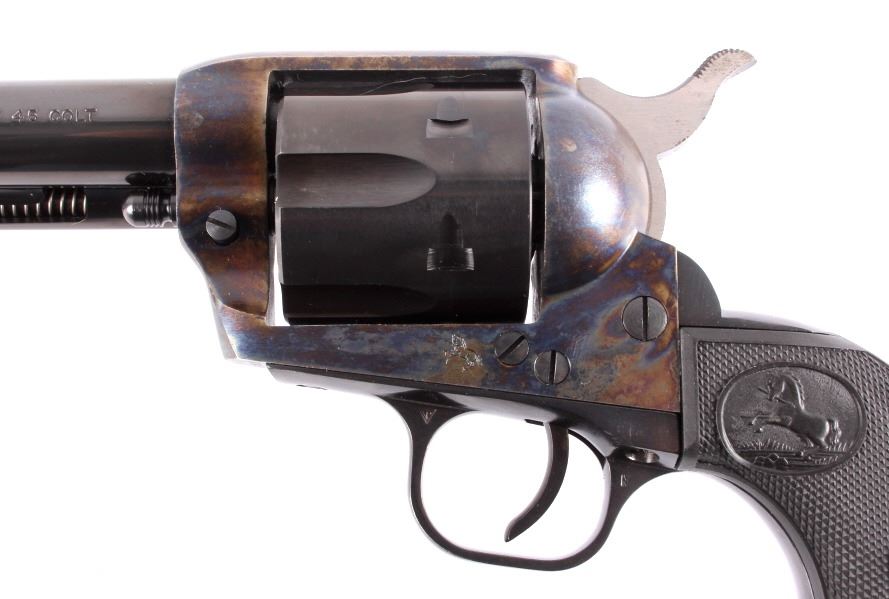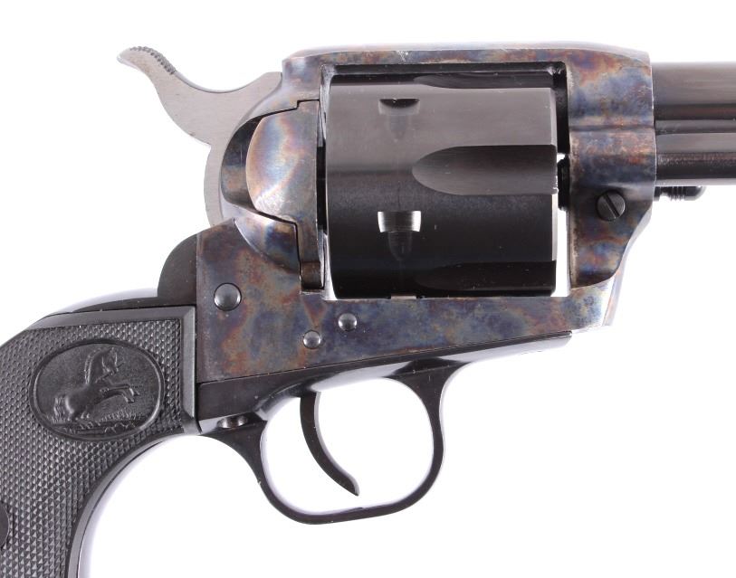 This is an exceptional Colt Cowboy single action revolver chambered in the .45 Colt caliber. The revolver shows a beautifully toned case hardened frame with a blued 5.5" barrel and grip frame. The barrel is marked "Colt Cowboy 45 Colt" and "Colt's Pt. F.A. Mfg. Co. Hartford, Conn. U.S.A.". The checkered grips show the Rampant Colt emblem on both sides. The Colt Cowboy shows very good, near new condition with 98%+ bluing and finish. The revolver measures 11" with a 5.5" barrel. Serial number is TF08190. This is a modern manufactured handgun and requires an FFL or NICS background check.