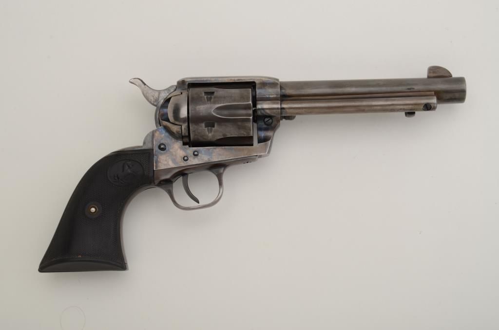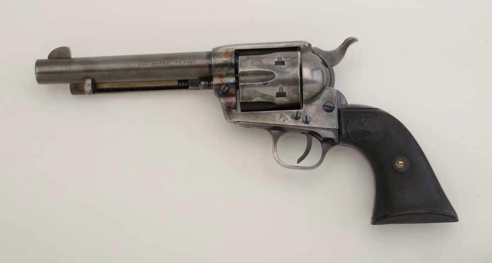 Colt “Cowboy” Single Action revolver, .45 Colt cal., 5-1/2” barrel, blue and case hardened finish, checkered hard rubber grips, #TF02192. This gun is in overall very good condition with traces of blue in protectedareas of the barrel assembly and straps and approx. 40% original case colors on the frame, crisp action and markings, very good bore and grips. Est.: $300-$600.