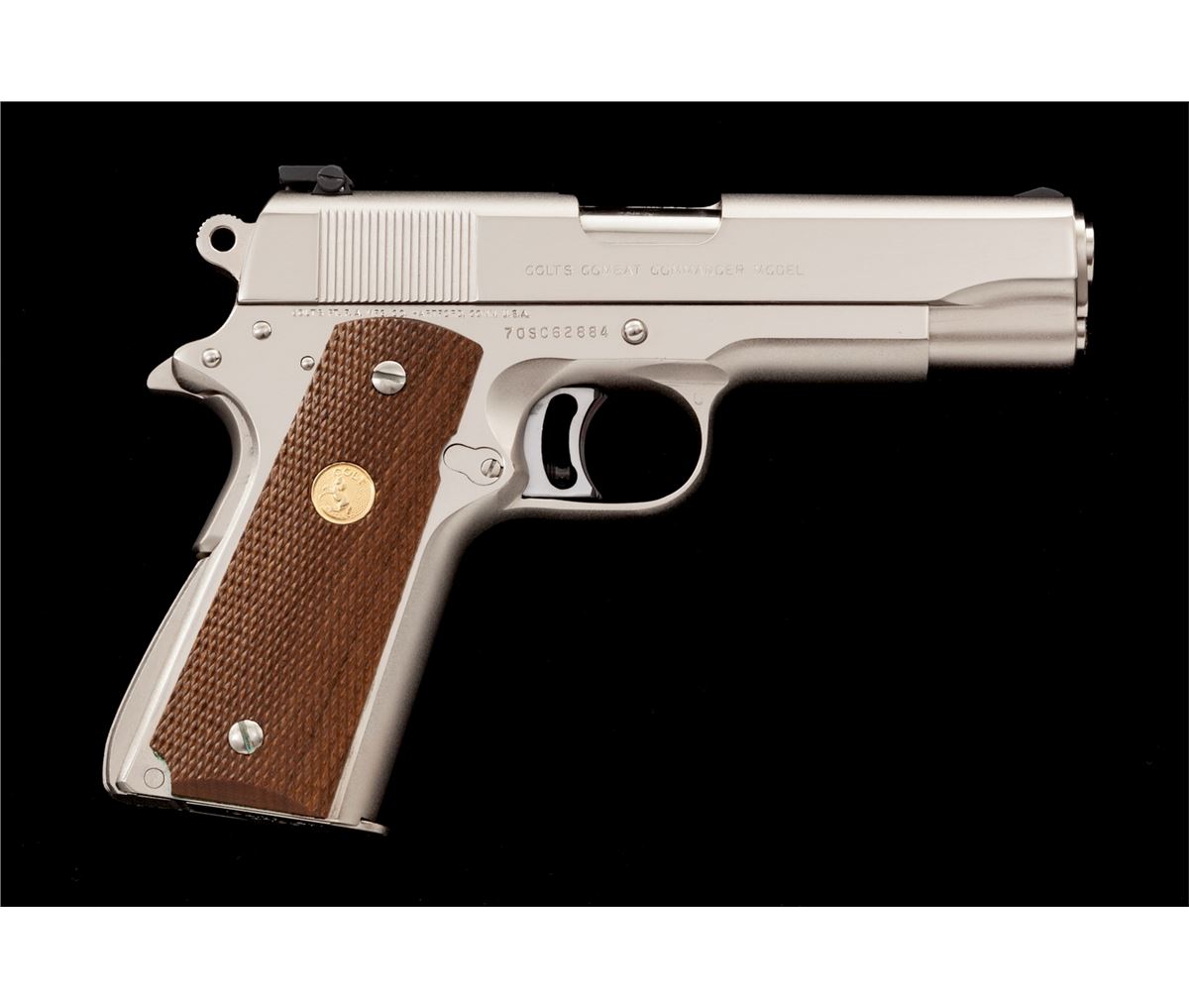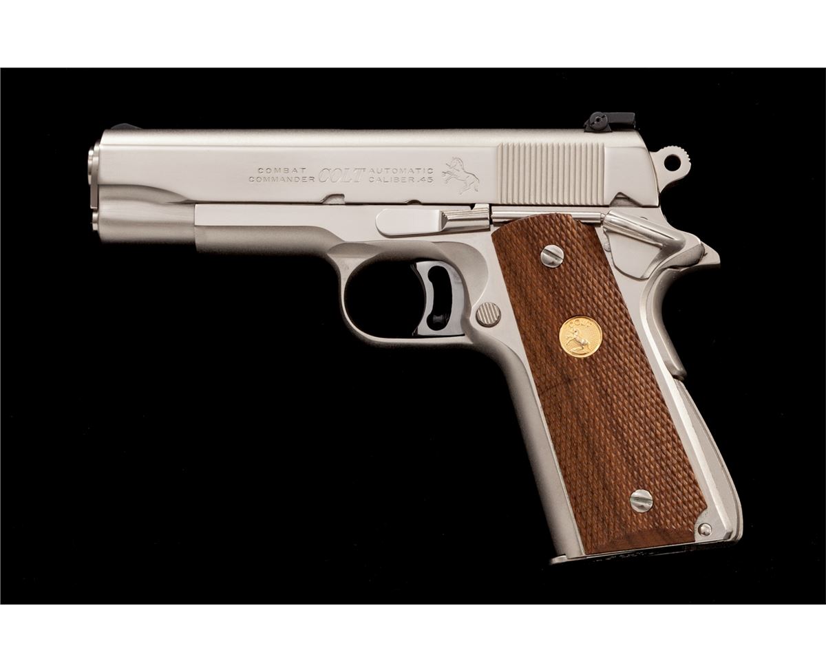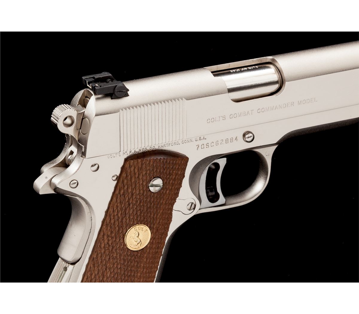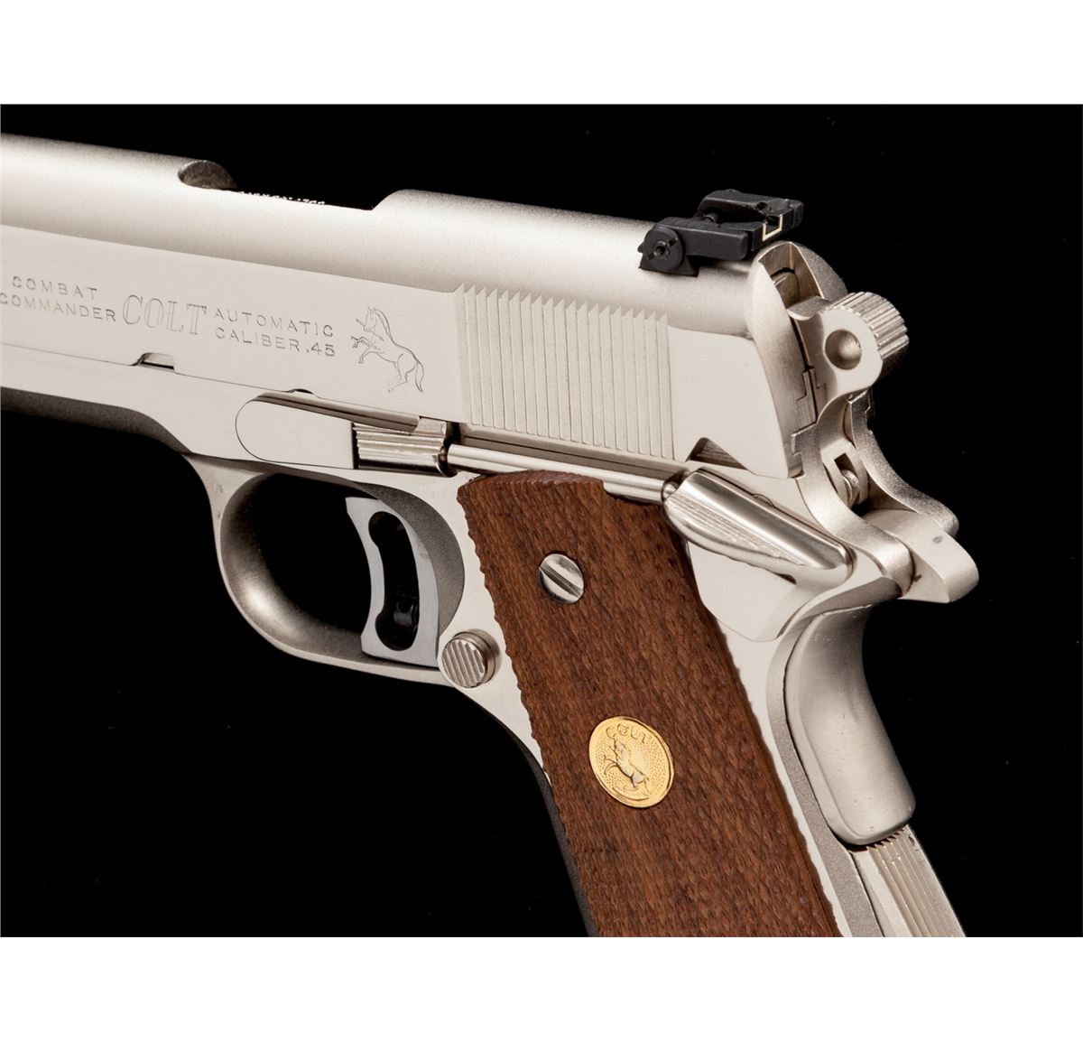 Colt Custom Combat Commander Semi-Automatic Pistol, #70SC62884, .45 ACP cal., 4-1/4'' barrel, bright nickel finish, factory checkered walnut grips with Colt medallions, in Colt Custom Gunshop green labeled box with instructions. Special Commander features factory cut wide trigger slot and wide Gold Cup trigger installed; MMC rear sight with standard front sight. Condition is excellent, appearing as new and unfired. Box shows light wear and tattering. Est.: $1,200-$1,800. (Modern/PPT)