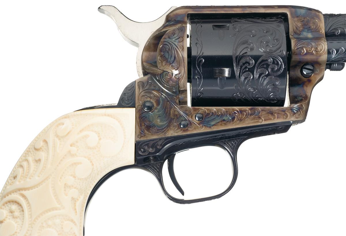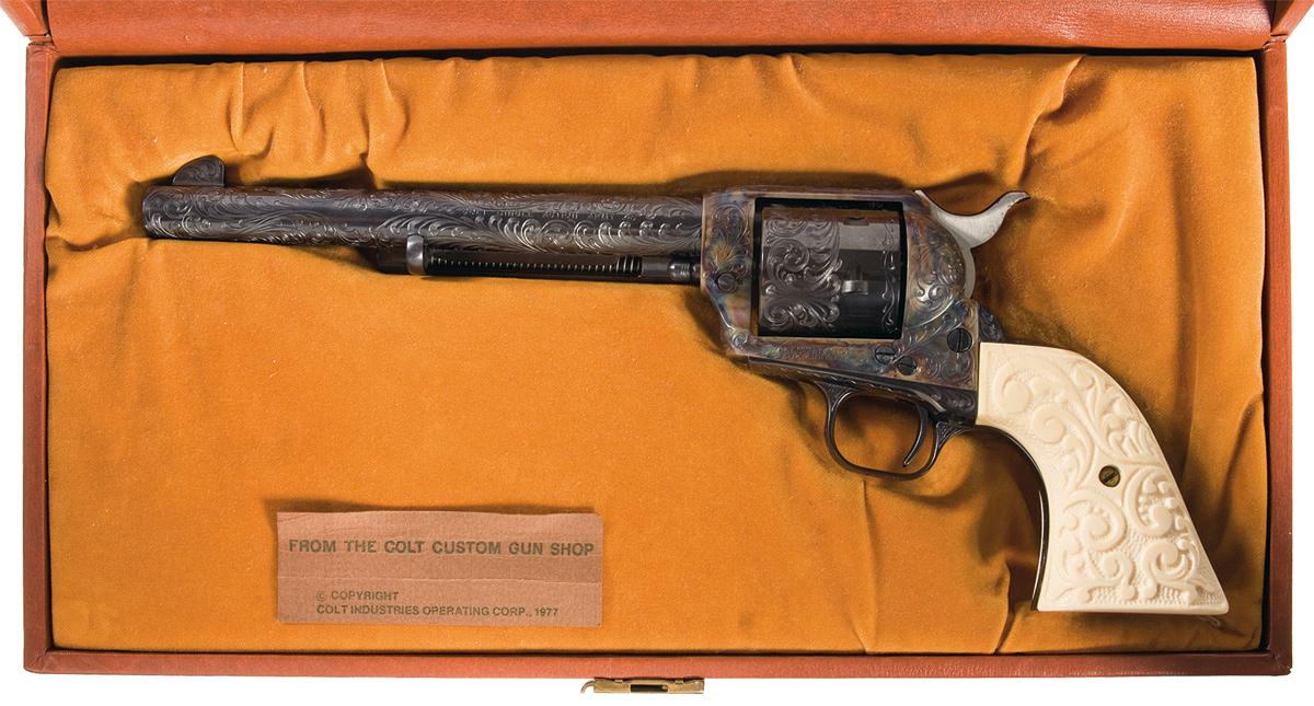 Manufactured in 1977, in the transitional period before the 3rd Generation had the "SA" suffix replaced with the signature prefix. All of the standard markings are present, with the addition of high quality factory Class "B" engraving, with fine scrollwork on the barrel, frame, cylinder, backstrap, outer edge of the ejector housing, toe of the front strap and the trigger guard. The top of the ejector housing has a wavy line and scallop design. The matching serial number is marked on the bottom of the frame and on the left side of the front and back straps under the grip. The front strap under the grip is also marked "COLT ENG". Standard blade front and frame notch rear sights, unfluted cylinder and fitted with two piece ivory grips with scroll carving with a punch dot background. Complete in a Custom Shop leatherette case with gold embossed lettering, gold lining and hanging tag.