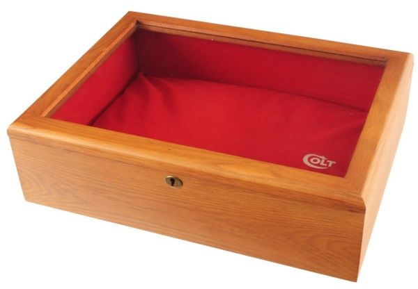 Originally housed a pair of engraved Colt pistols that Jack Dean had made for George Bush when he was elected president. Measures 18 1/2" wide x 14"deep x 5 1/2" tall. From the collection of retired Texas Ranger Captain & US Marshal Jack Dean.