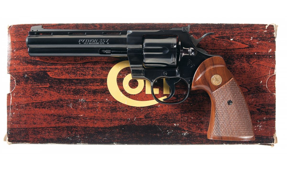 Manufactured in 1981. Standard markings and features with a ramp front sight and adjustable Elliason rear sight. Comes with original Colt "wood grain box" with Colt Custom Shop label numbered to the gun, (in box) papers and Clark shoulder holster with twelve bullet loops. The label also reads "w/custom tuning & sights".