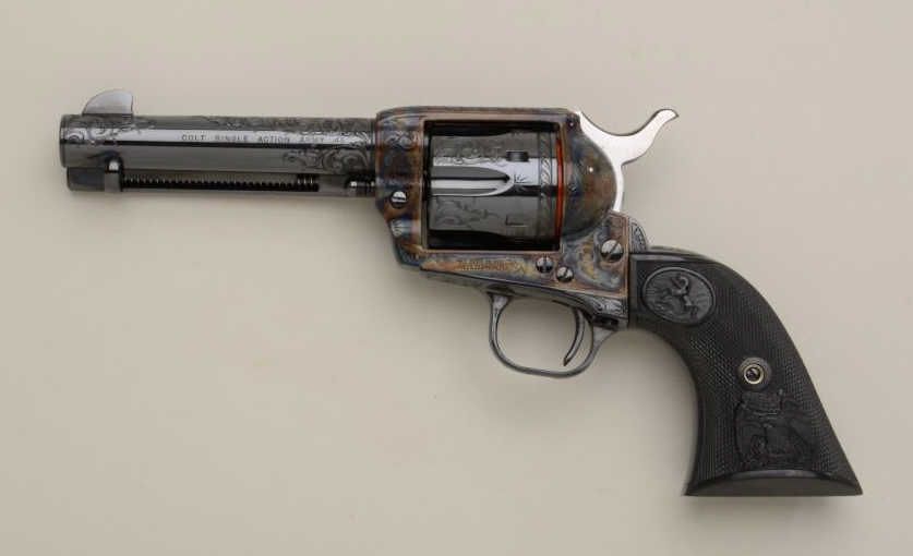 Colt Custom Workshop Factory “C” engraved 4th Generation SAA revolver, .45 cal., 4-3/4” barrel, blue and case hardened finish, checkered eagle black hard rubber grips, #S57534A in factory two-piece blue box withinstructions, hang tag and outer white shipping box numbered to this gun. This gun is in like new condition showing little handling; bright blue and fiery case colors. Est.: $2,750-$3,750.