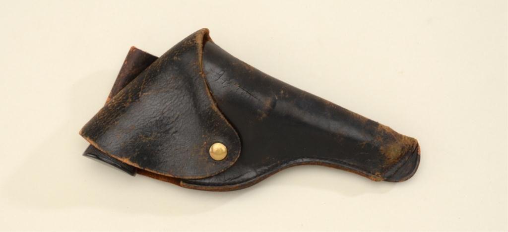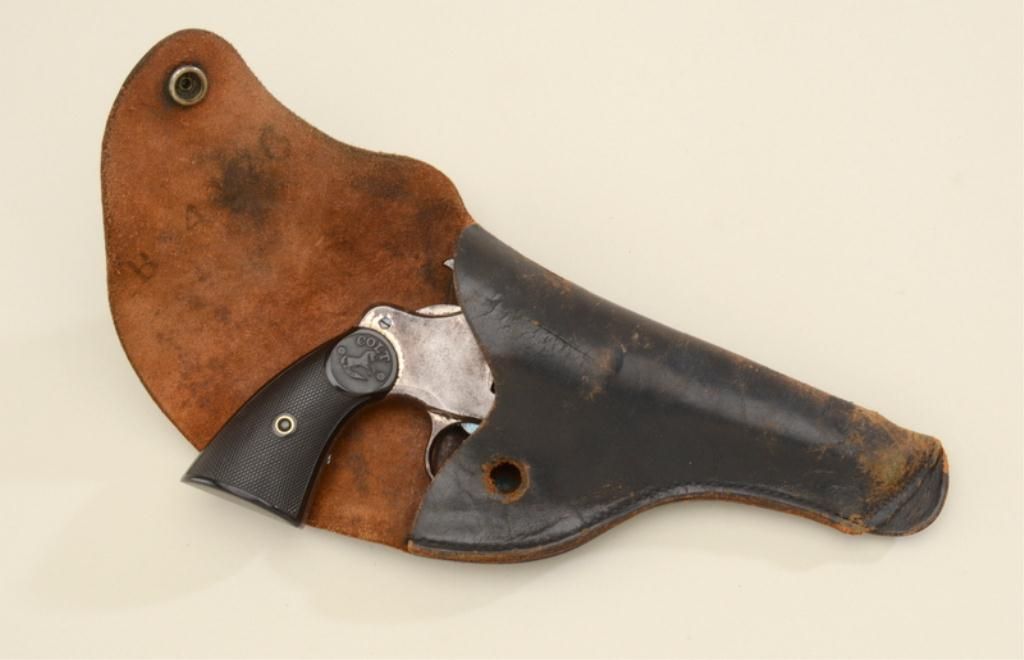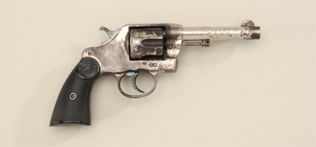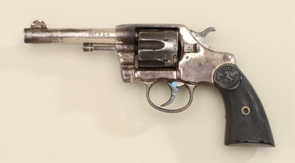 Colt DA hand ejector revolver, .41 cal., 4-1/2” barrel, nickel finish, checkered black hard rubber grips, #182114. This gun is in overall good condition showing approx. 20% original nickel finish with balance gone to a dark patina, fair bore, good action and markings, good grips, uncleaned and in an old law enforcement type leather flap holster. Est.: $200-$400.