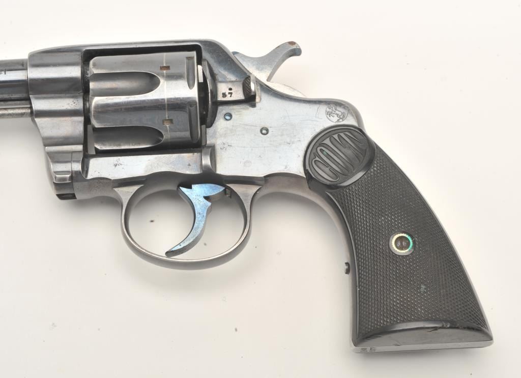 Colt DA revolver, .41 caliber, 6” barrel, blued finish, checkered hard rubber grips, S/N 148577, i