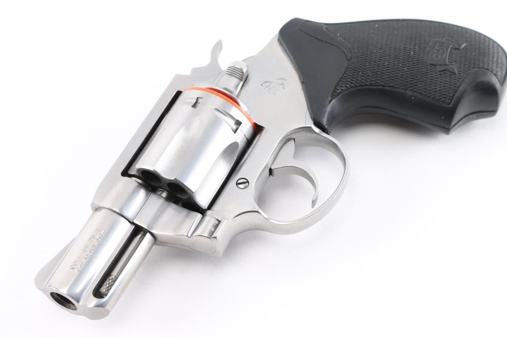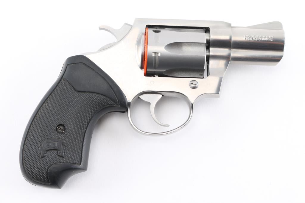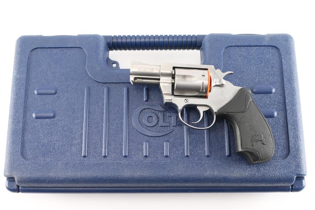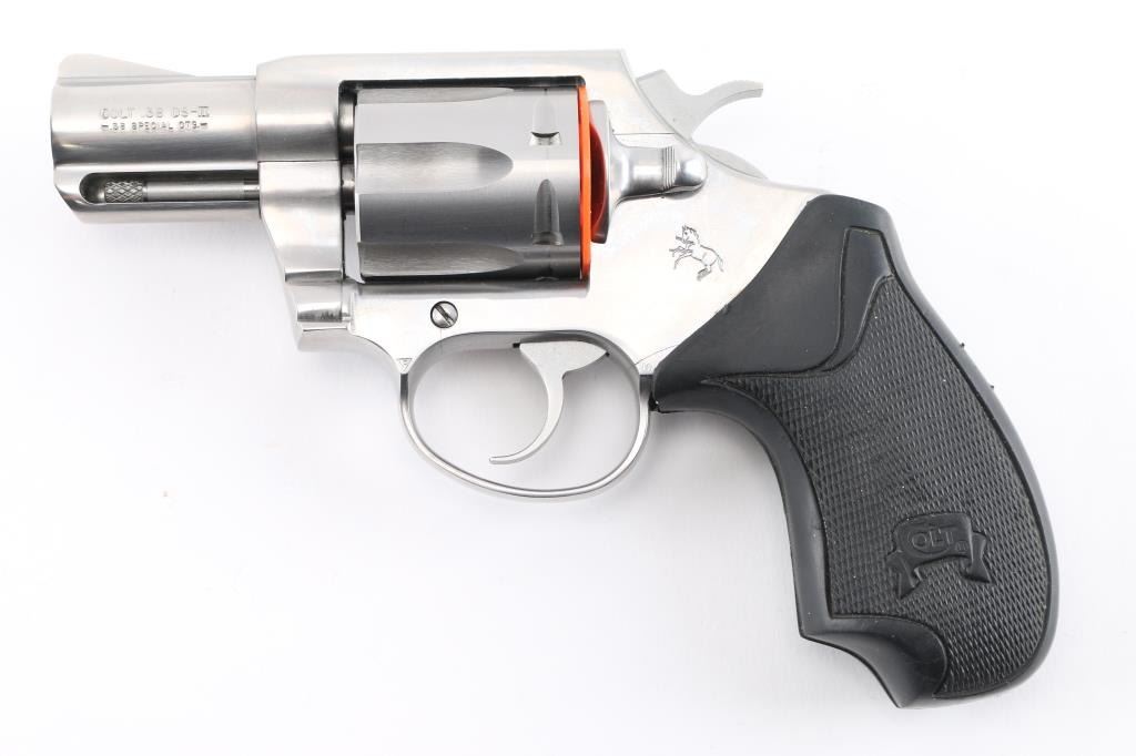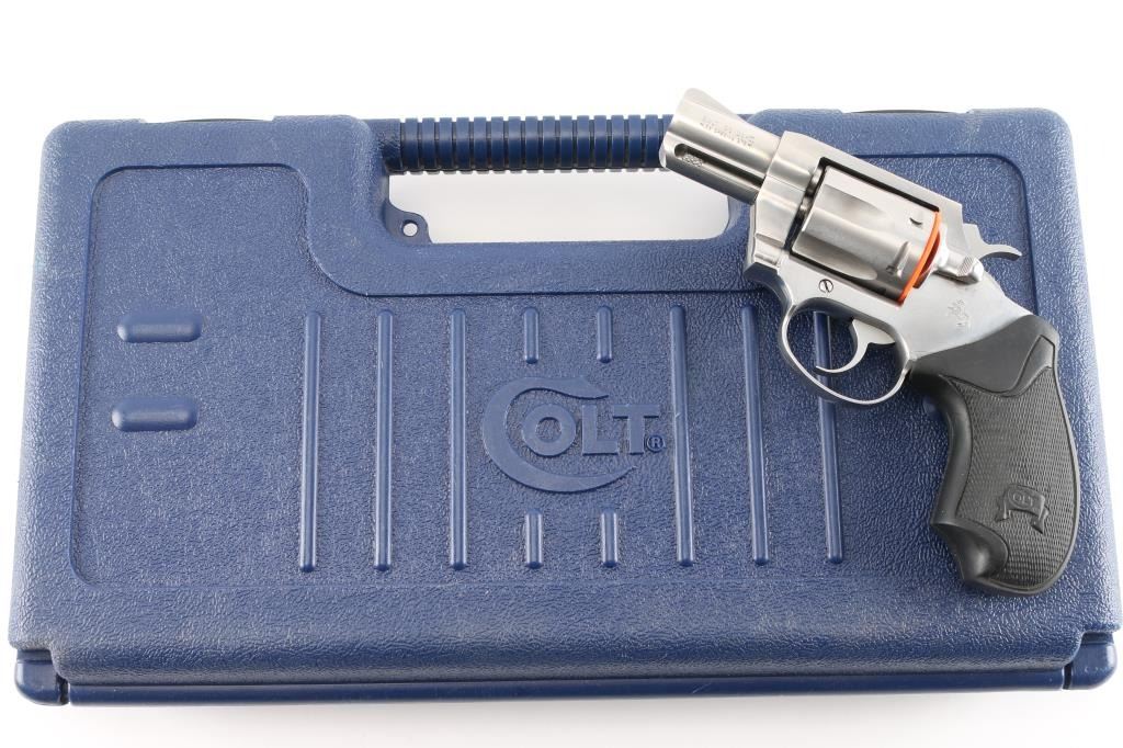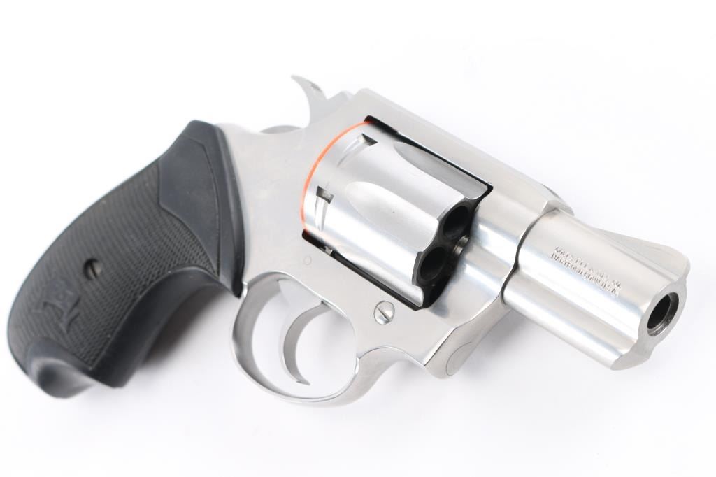 'Detective Special II' Small frame double-action snub-nosed revolver manufactured circa 1998. Features all steel construction, a stainless finish, 2" barrel, blade front sight, square notched rear sight, smooth trigger, exposed hammer with polished flats & serrated spur, fluted six-shot cylinder, shrouded ejector rod, and two-piece black rubber grips. Overall condition is very good with a few signs of handling, very small scratch on frame, bore is in excellent condition. Action is smooth with tight lock-up. Comes with original hard case.