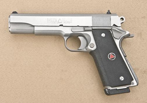 Colt Delta Elite Government Model semi-auto pistol, 10mm cal., 5” barrel, stainless steel construction, wrap around hard rubber grips, #DS08029. This gun is in overall excellent condition showing a fine bore, crisp action,sharp markings, excellent grips with fixed white dot sights and a Wilson Combat weighted magazine. Est.: $500-$1,100.