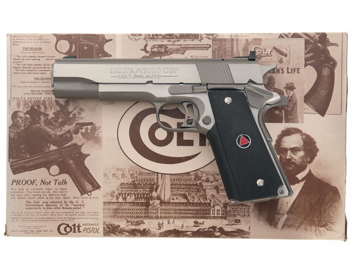 Introduced in 1992, this is the target version of the Delta Elite in stainless steel. Features adjustable rear and fixed front sights on a solid rib, serrated adjustable trigger, combat style serrated hammer, and textured hard rubber wraparound grips with the "Delta" medallions. The pistol has the standard markings of the Delta Gold Cup model. Complete with the original blue plastic case and picture sleeve numbered to the gun.