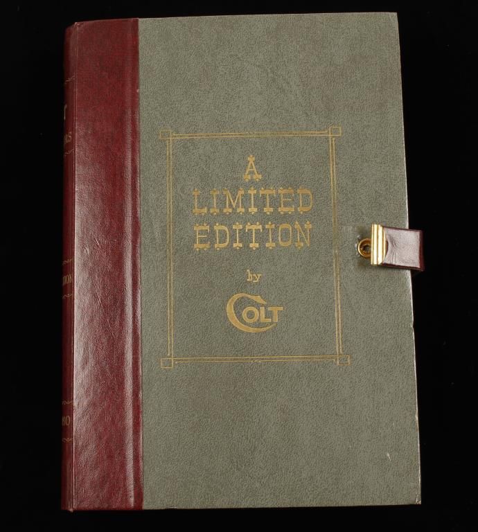 Cased set of consecutive numbered reproduction single-shot swing-out barrel derringers. In a red satin and velvet lined "book" (A Limited Edition) presentation case. These have alloy frames and barrels and the barrels show the beginnings of pitting. The grips are walnut. They both have scuffs and wear on their two-tone exteriors. These date from 1959 to 1963. Includes Colt "Bookmark" gift tag and a cleaning brush. Condition is near fine. *Curio & Relic*
