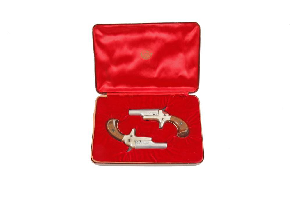 Colt Derringer Cal .22S SN:34711D/34712D Nice cased pair of single shot Derringers in a velveteen & satin lined red case with the rampant Colt on the lid. Small pistols are nickel finished with smooth wood birds head grips. Very nice cased set althoNice cased pair of single shot Derringers in a velveteen & satin lined red case with the rampant Colt on the lid. Small pistols are nickel finished with smooth wood birds head grips. Very nice cased set although lining does show somefraying around the edges.
