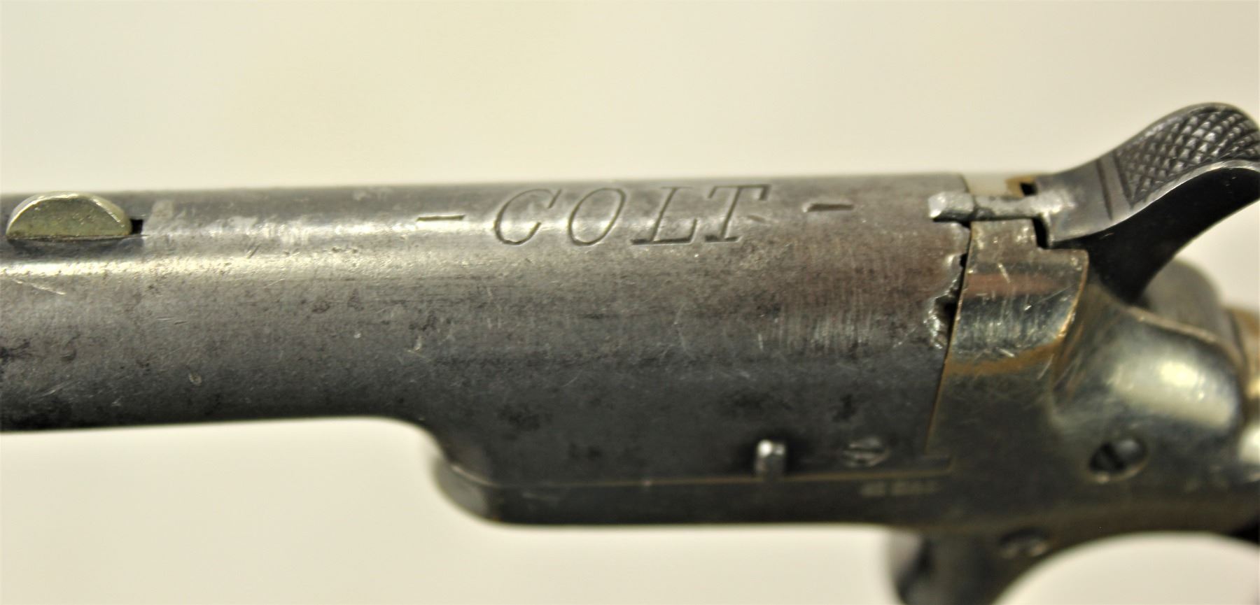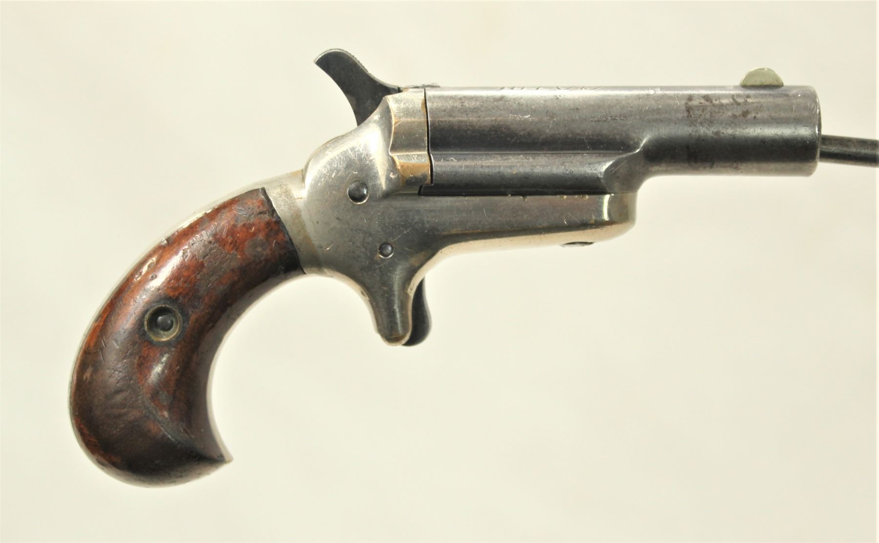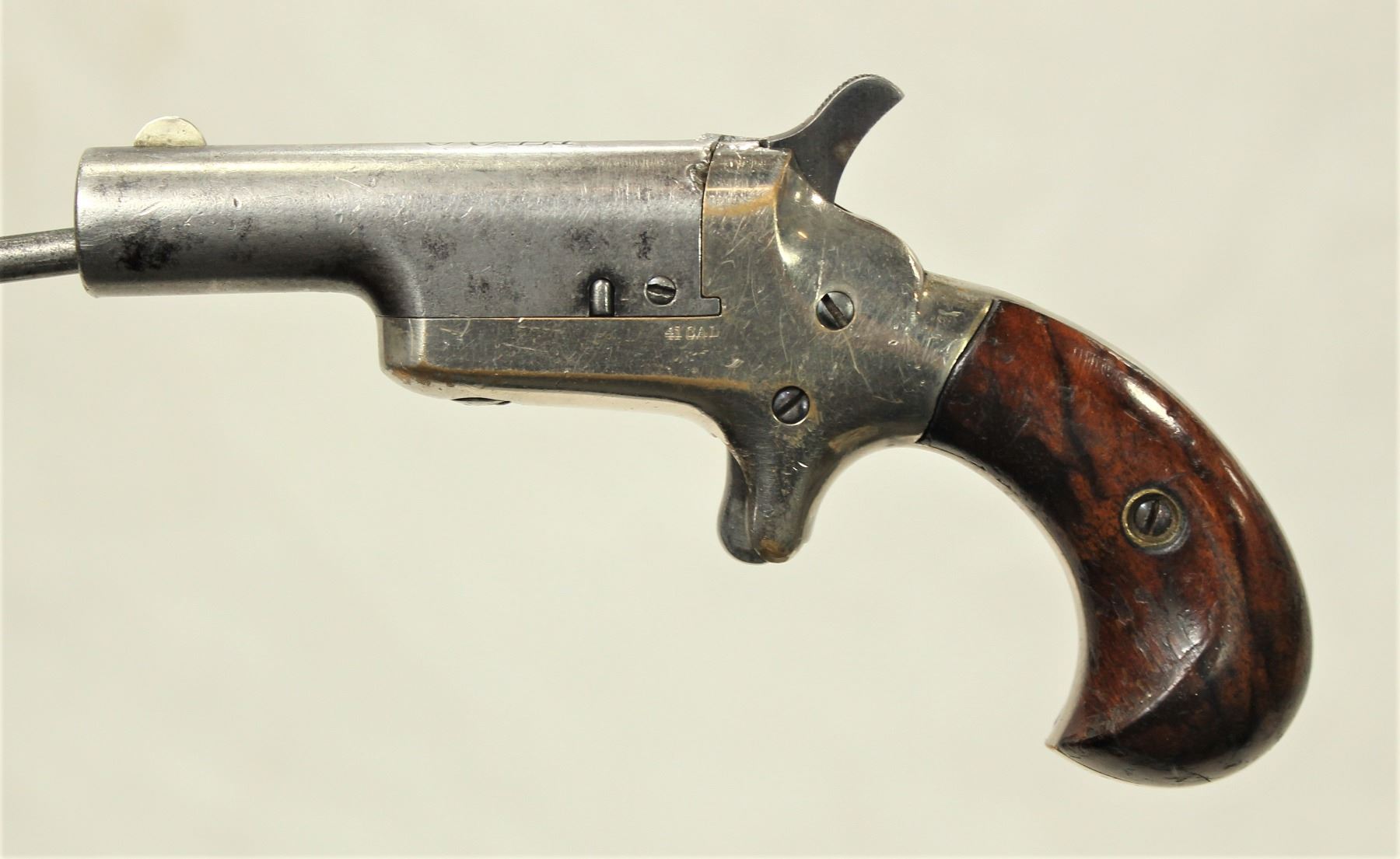 Third Model Derringer, in .41 Rimfire, with blue finish, silver plated frame and 2-piece walnut grips.