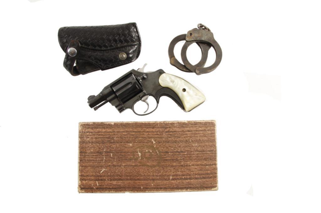 Condition: Excellent as refinished with minorDouble action 6 shot square butt revolver good for concealed carry. Reblued finish, Faux pearl grips with grip adapter, 2" barrel with fixed sights, good bore and action. Condition: Excellent as refinished with minor wear at the muzzle from carry in the basket weave Clark Holster include with the original box numbered to the gun and a nice set of Smith & Wesson handcuffs. Excellent law enforcement package! May have belonged to an under coverpolice woman.