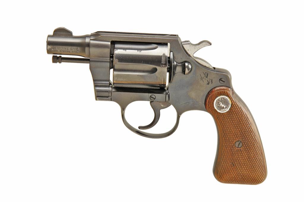 Colt Detective Spec Cal .38spec SN:788053 Double action 6 shot pocket revolver. Blued finish, checkered wood square butt grips, 2" barrel, fixed sights, good bore and action. Condition: Very good with slight muzzle wear and a few very small rust spotDouble action 6 shot pocket revolver. Blued finish, checkered wood square butt grips, 2" barrel, fixed sights, good bore and action. Condition: Very good with slight muzzle wear and a few very small rust spots just starting todevelop. No box.