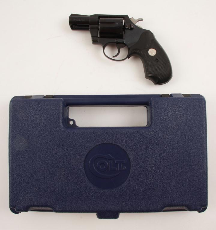 Colt Detective Spec Cal .38spec SN:AD3512 DA 6 shot concealed carry revolver. Blued finish, black checkered rubber grips, 2 1/8" barrel, fixed sights, good bore and action. Condition: Excellent with no sign of use. In blue plastic carry case with insDA 6 shot concealed carry revolver. Blued finish, black checkered rubber grips, 2 1/8" barrel, fixed sights, good bore and action. Condition: Excellent with no sign of use. In blue plastic carry case with instructions.