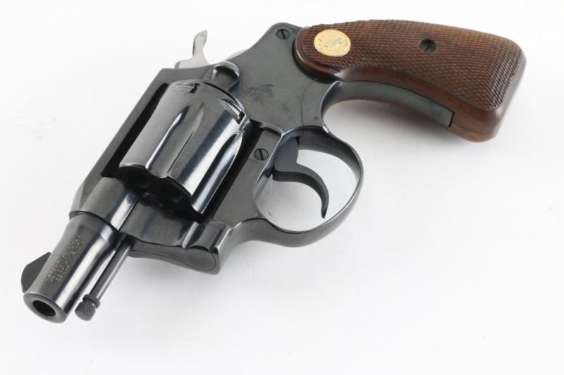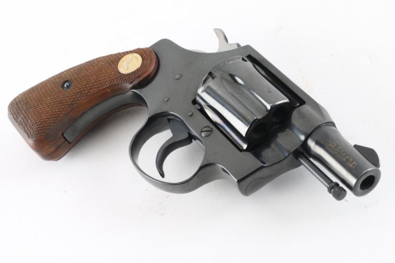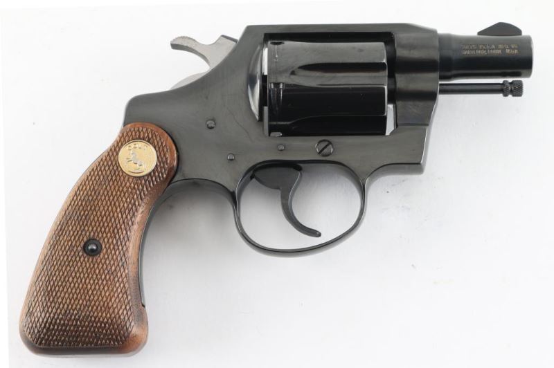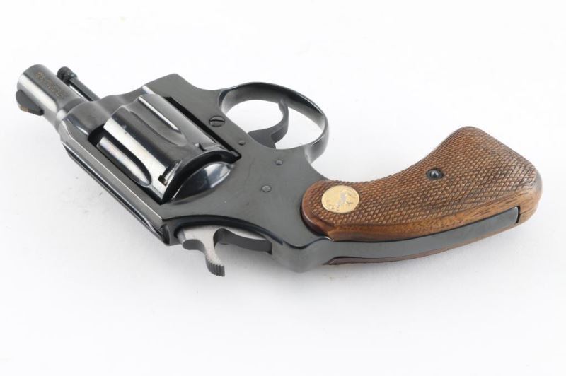 Vintage, 1960 era, small frame double-action snub-nosed revolver chambered in .32 New Police. Features all steel construction, a blued finish, 2" barrel, serrated blade front sight with gold paint added, square notched rear sight, smooth trigger, exposed hammer with polished flats & serrated spur, fluted six-shot cylinder, non-shrouded ejector rod, and two-piece checkered walnut grips with inlayed gold Colt medallions. Bore looks good, dusty. Metal finish looks great with really no signs of handling. Rampant Colt and lettering edges still crisp. Wood grips look good. Condition is NRA Excellent **C&R Firearm**