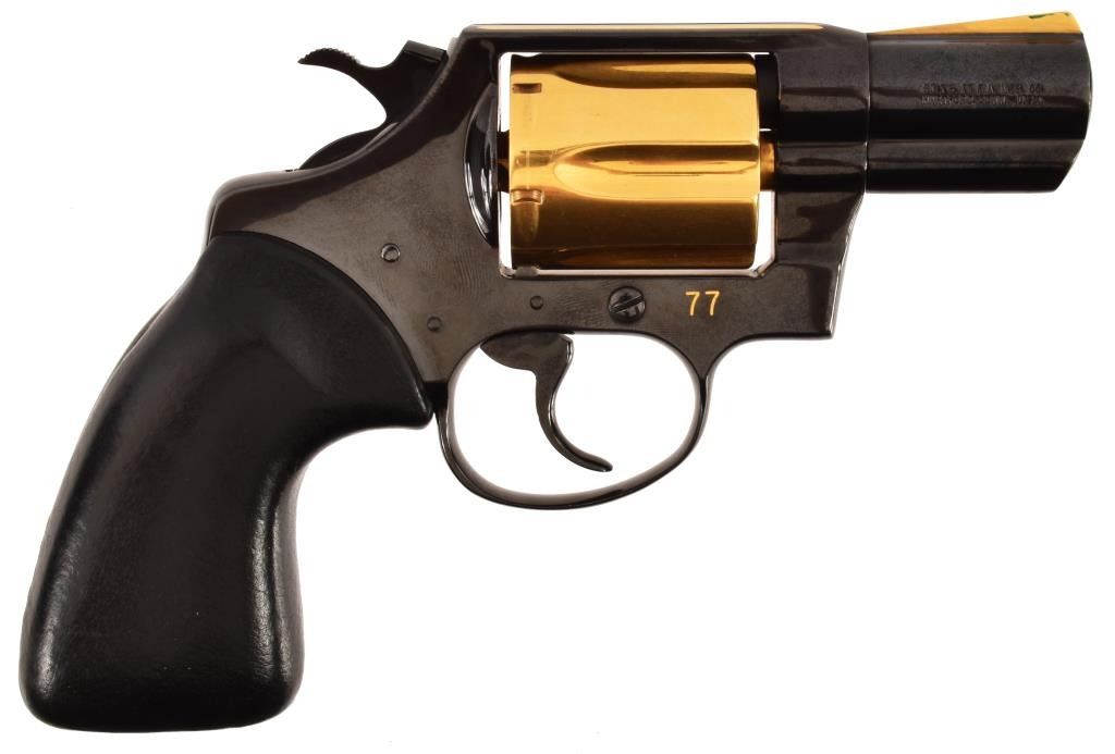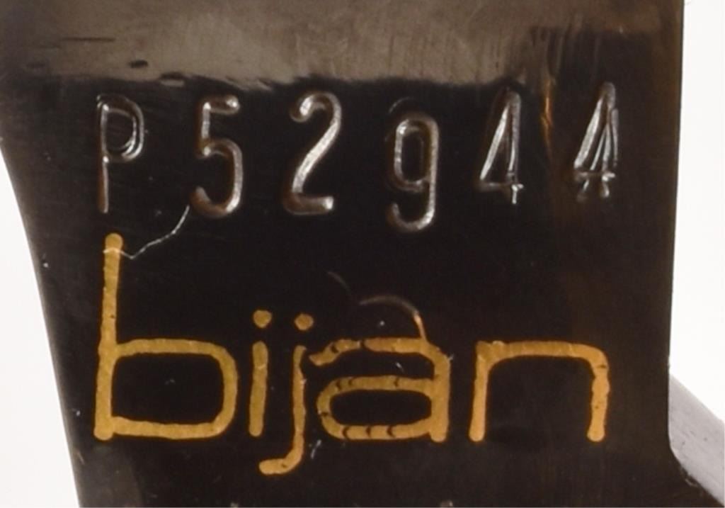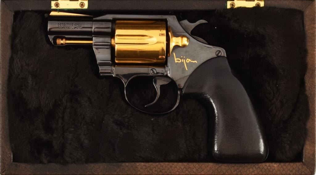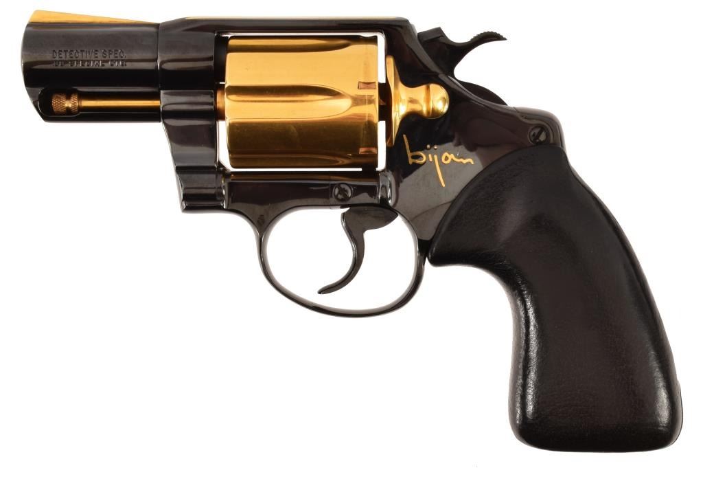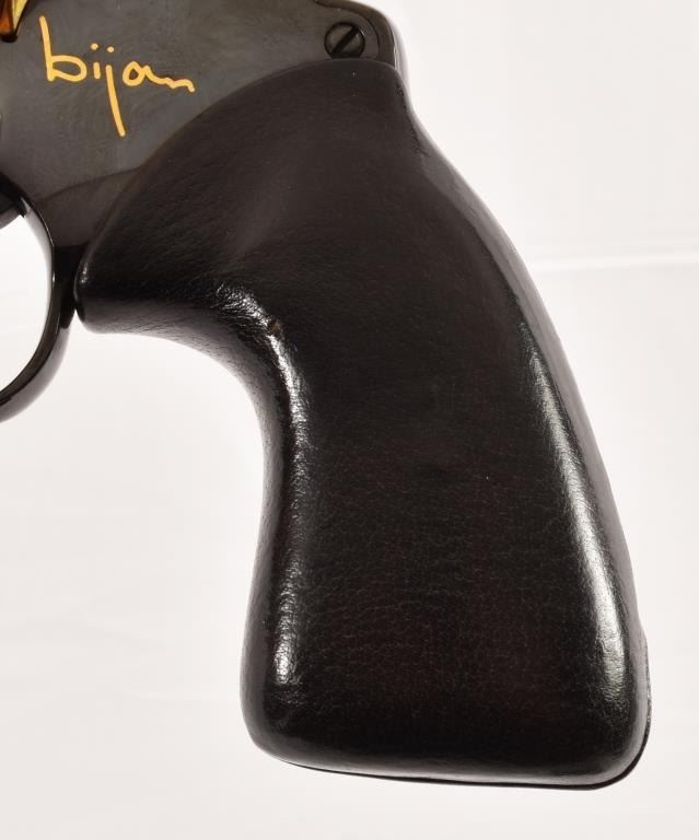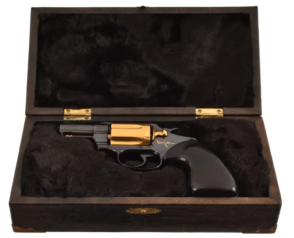 Rare limited edition Deluxe model made for Beverly Hills Fashion designer Bijan. Has gold plated parts and gold inlaid “Bijan” signature, custom leather covered grip and fancy presentation case. Number 77. Barrel Length 2". SN P52944