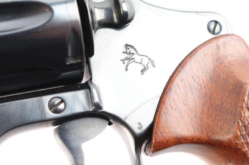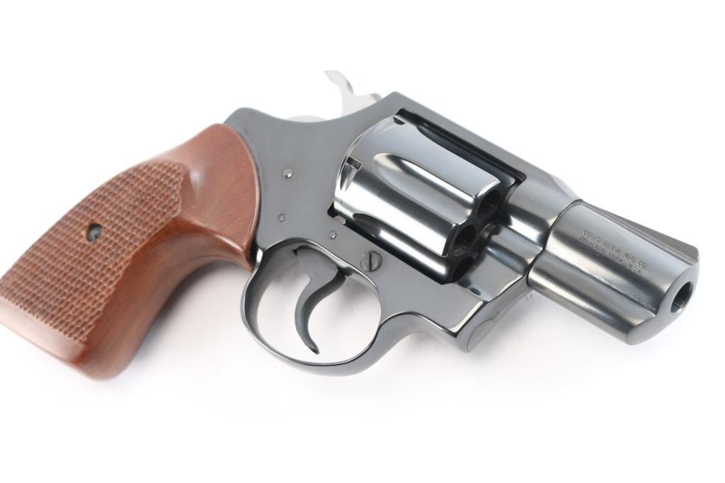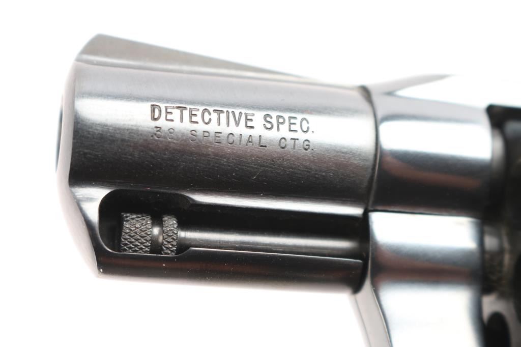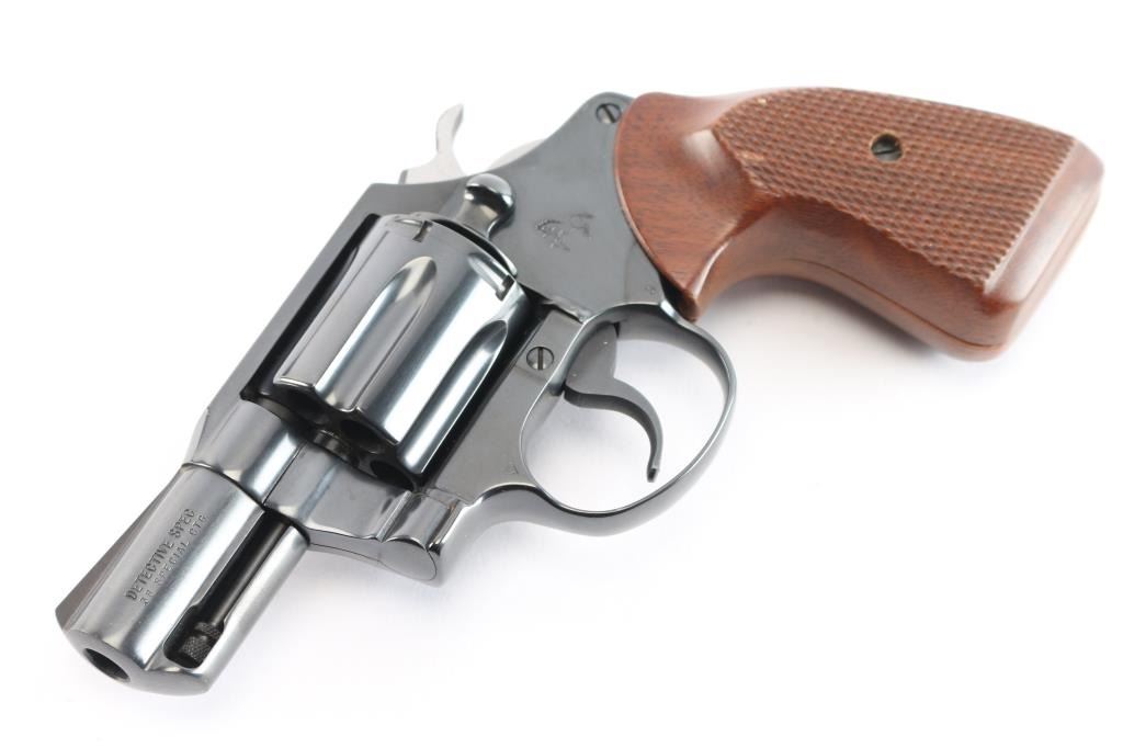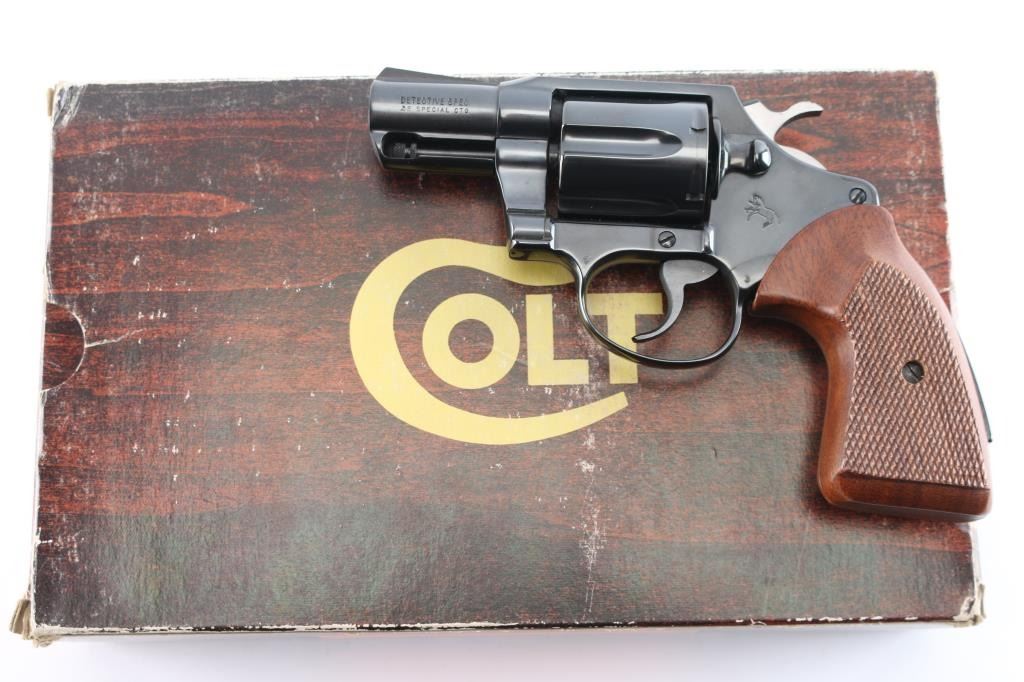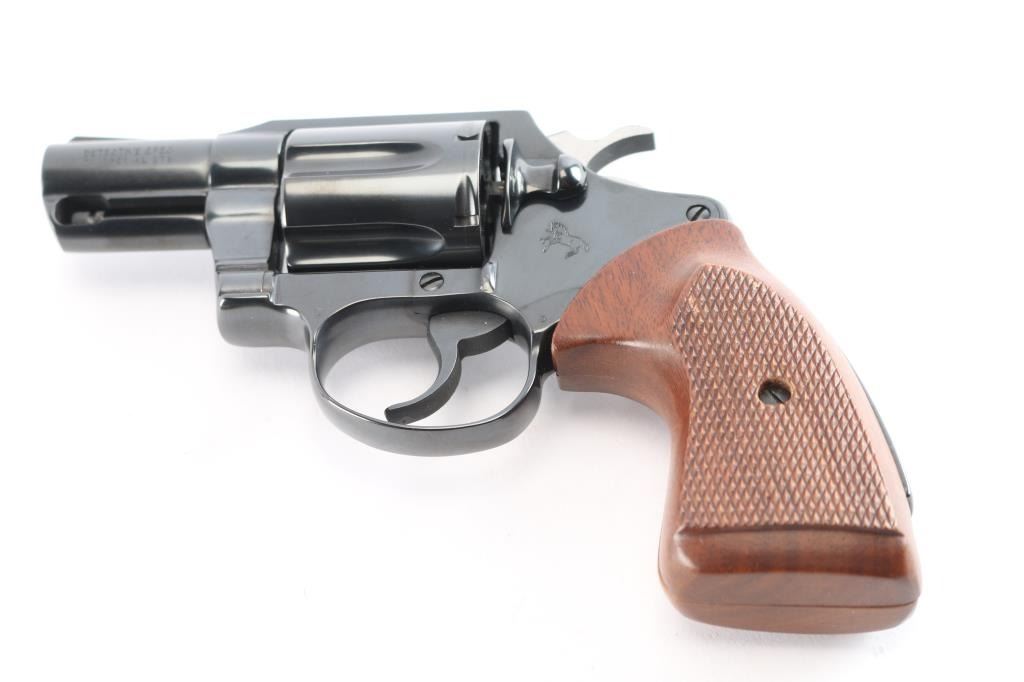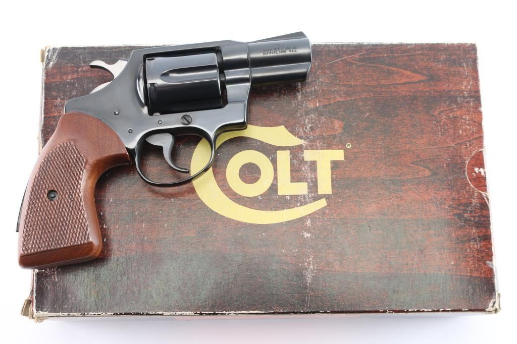 American made snub nosed double action revolver chambered in .38 Special, manufactured circa 1982 in Hartford, CT. This is Colt's third series of the 'Detective Special' (1973-86). Revolver features a gloss blued finish, 2" barrel, smooth ramped front sight, notched top-strap rear sight, shrouded ejector rod, full underlug, long-fluted six-round cylinder, smooth curved trigger, two-tone hammer with polished sides, serrated hammer spur, firing pin on hammer nose, and two piece checkered walnut grips. The original blued finish retained is approximately 99% with little remarkable to speak of. Metal displays no rust or deformation. Bore is bright with strong rifling, and the cylinder chambers are also excellent. The action is really tight with a solid lock-up (needs a break-in). This revolver is in like new condition. Includes original cardboard box with paperwork.