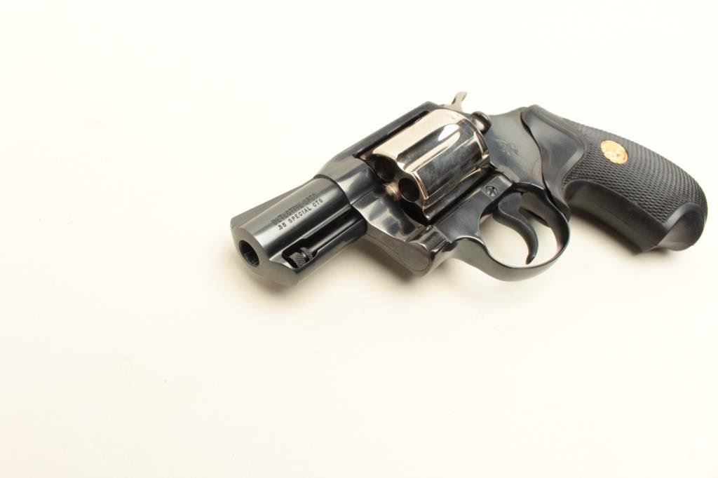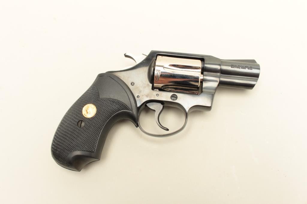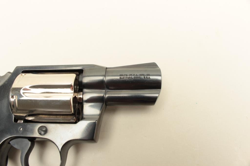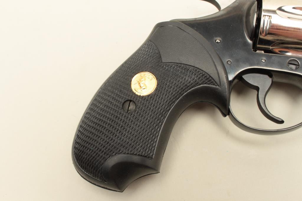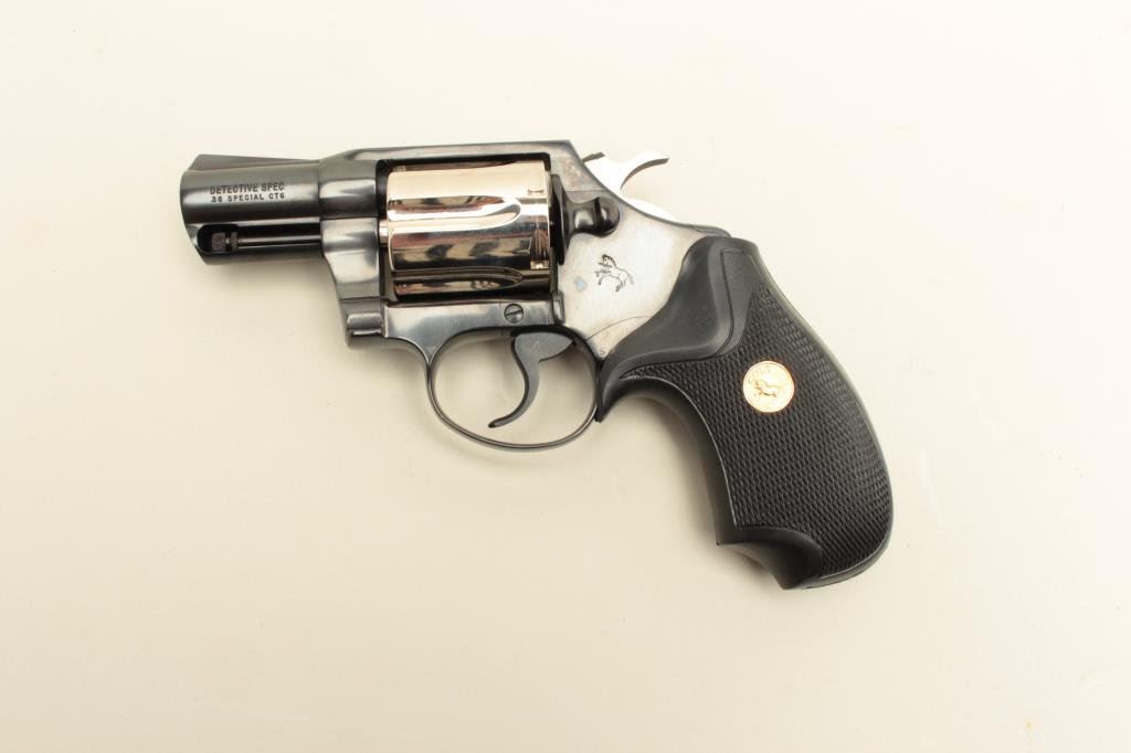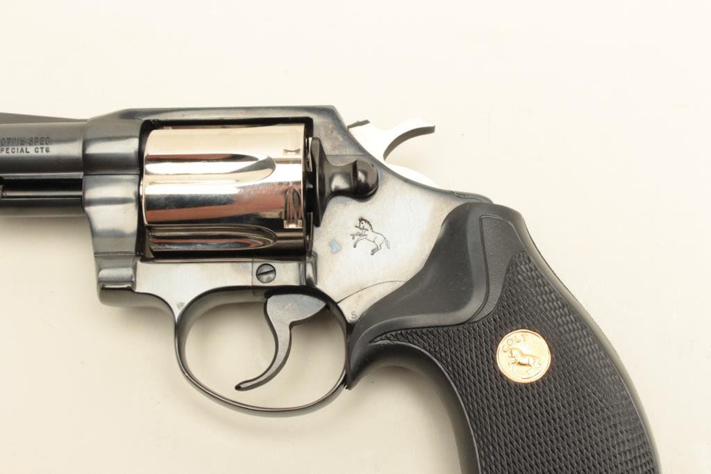 blued finish with nickel finish to cylinder (Davidson Supply two tone special order of 1982?), checkered Colt medallion rubber grips, S/N P59623, in near new condition with factory wood grain cardboard box, inserts, instructions and misc. paperwork including a Colt Industries letter dated Nov. 21, 1983, speaking about the Davidson Supply Custom Detective Special revolvers. (Modern/PPT). Est.: $800-$1,600.