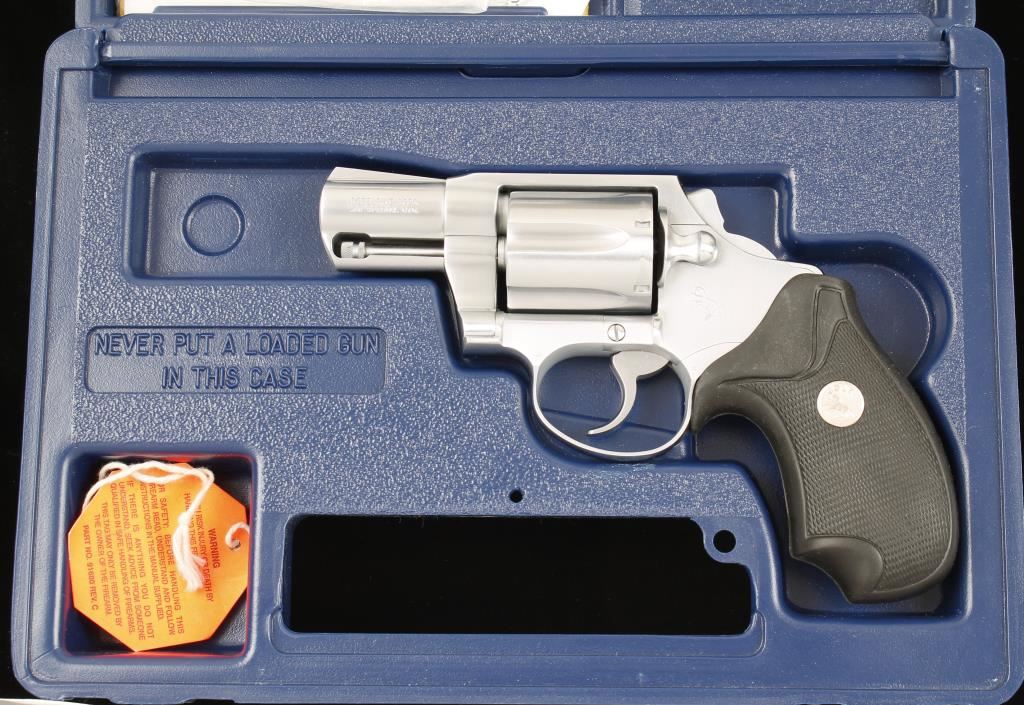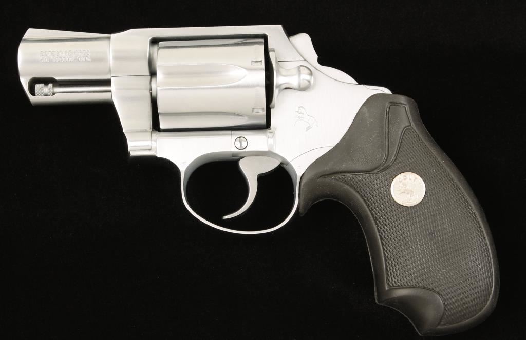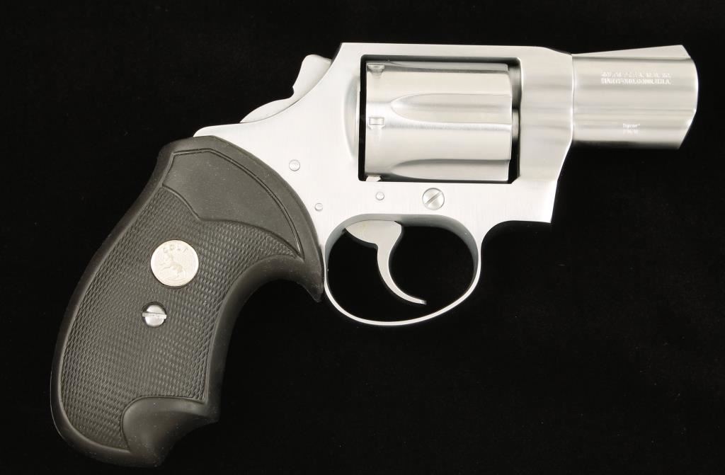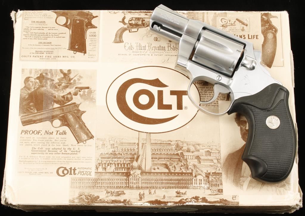 Hard Chrome double-action only 6-shot revolver with a 2" barrel and full underlug. Bobbed hammer. Finish is near perfect. Has a Trijicon insert in the front sight ramp but it may not be working. Bore and cylinders are immaculate and there is sharp rifling. Comes with Colt factory Combat grips. Function is smooth with rock-solid lock-up. Comes in the factory plastic case with documents and packaging and the protective factory cardboard sleeve (which is numbered to the gun). Condition is excellent. *Modern Firearm*