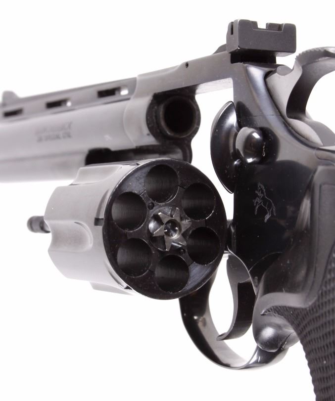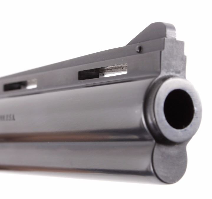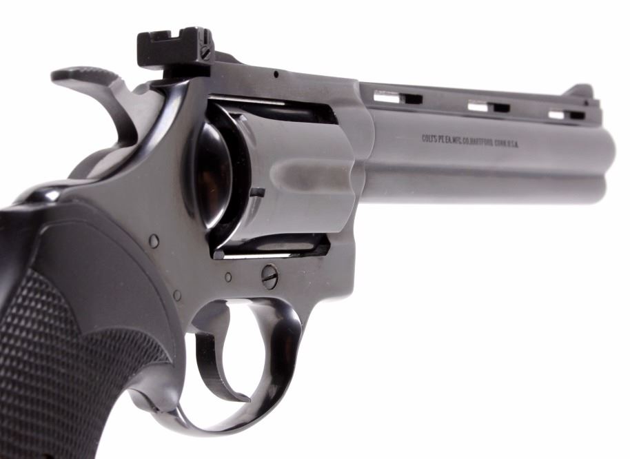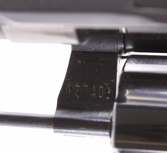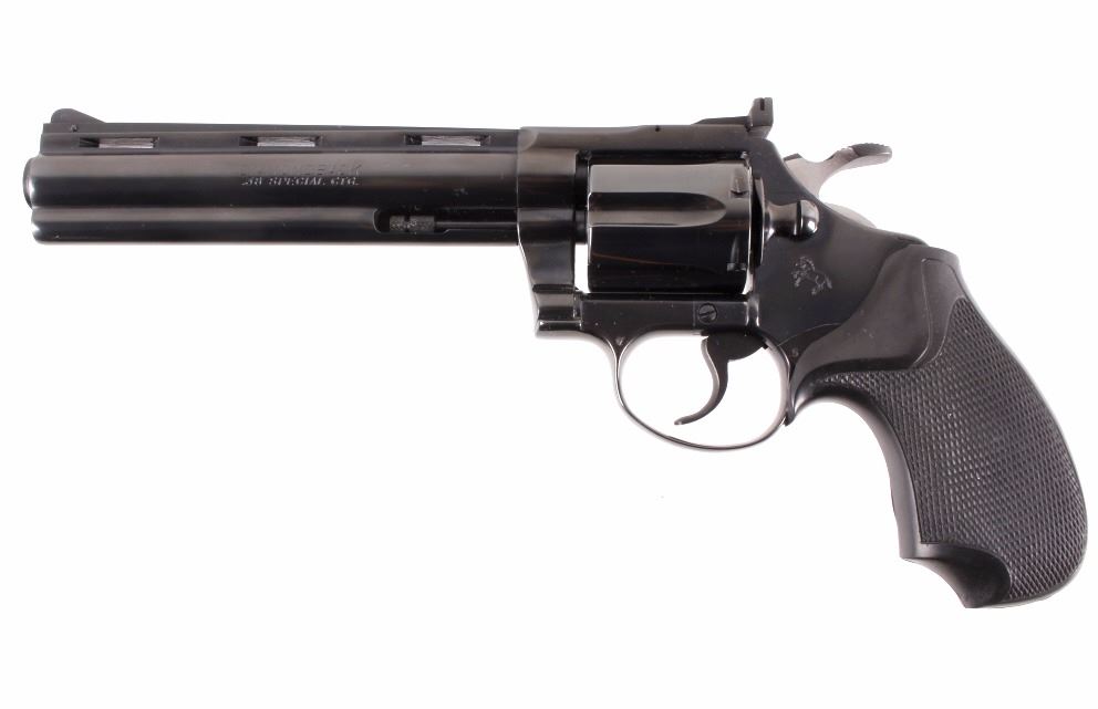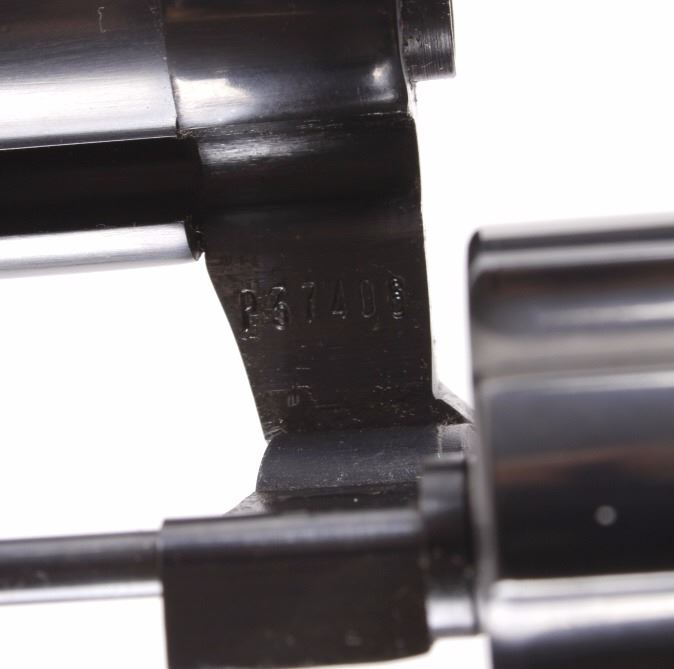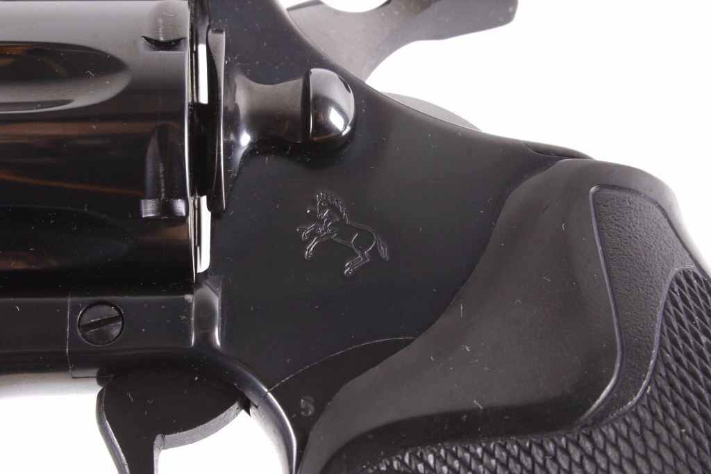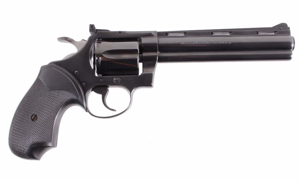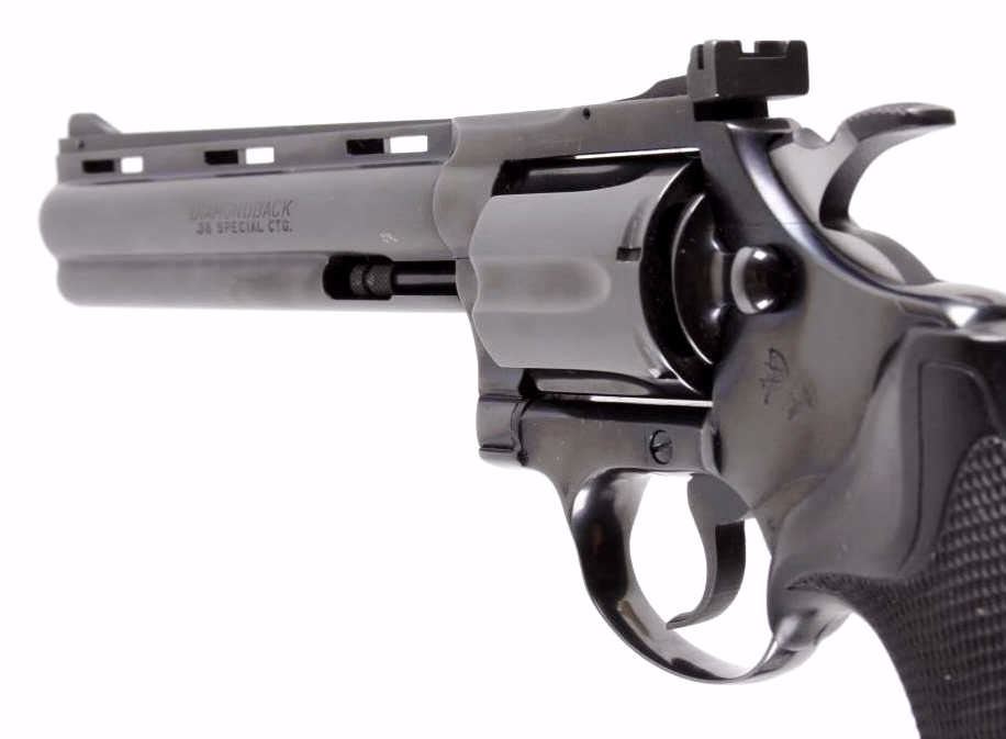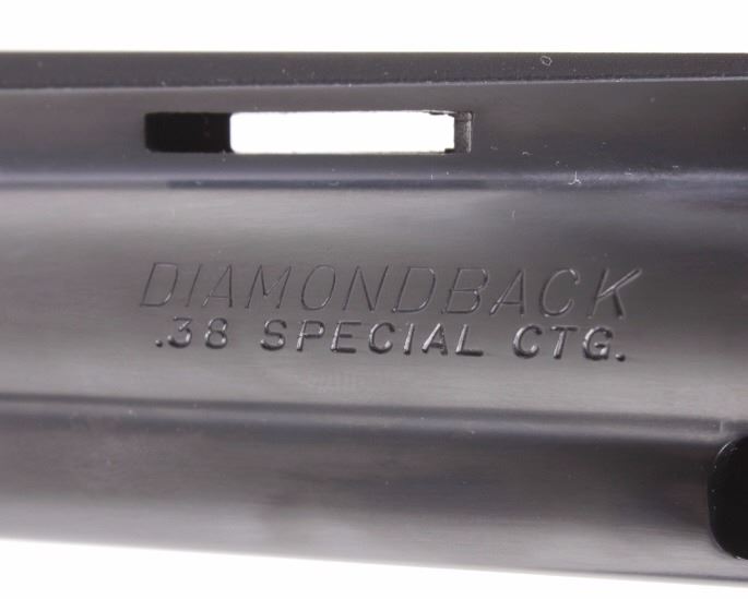 This is an exceptional Colt Diamondback model double action revolver chambered in a rare .38 Special CTG. The revolver shows a bright blue’d finish with full ribbed vented 6” barrel. The revolver shows 98% plus finish with black Presentation/Compac grips. The pistol is roll marked on the left side, “DIAMONDBACK .38 SPECIAL CTG. – VP (in a triangle) – 5 – (Colt’s prancing pony logo).” Marked on the right side, “COLT’S PT. F.A. MFG. CO. HARTFORD. CONN. U.S.A.” The Colt Diamondback has been discontinued since 1987 and was created as the scaled down target version of the Colt Python. The revolver shows a wide serrated target hammer, ventilated rib barrel, fully adjustable target sights, and full length barrel underlug. This is a very scarce variation of the Diamondback showing the 6” barrel with bright blue finish being chambered in a .38 SPL CTG. The all matching original pistol shows a serial number of P37406 and was manufactured in 1982.