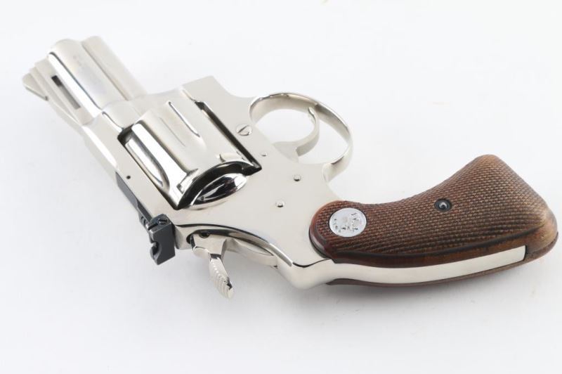 Double/single action revolver manufactured circa 1967. Features nickel finish, checkered wood grips with Colt medallions, 2.5" barrel with full length underlug and vent rib, adjustable sights. Bore and charge holes are excellent. Nickel finish is excellent, with few blemishes. Grips are very good with handling wear. Condition is NRA Excellent *** C&R Firearm *** [From the Jim Sigmon Collection]