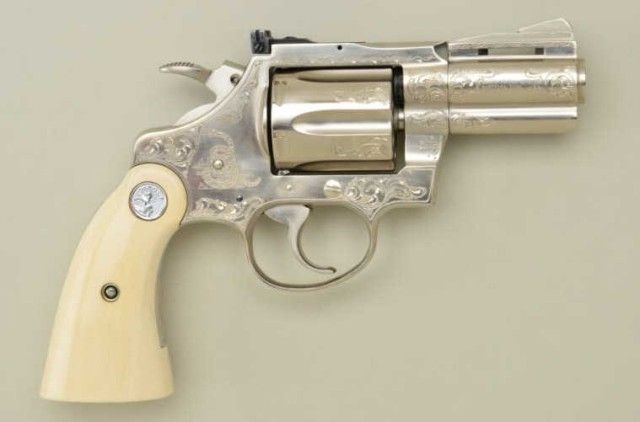 Colt Diamondback 38 Special caliber, 2” barrel, double action revolver, fully and finely engraved by John Adams Sr. with ivory grips by Dan Chesiak, Serial #D7218. The revolver is signed “J.A.” in stamped letterson the front of the frame. The engraving is a fine scroll with panel of rattlesnake on right side. The Colt is satin, nickel finished and in excellent condition as refurbished at time of ornamentation. Asigned letter on Adams & Adams stationary authenticates the engraving by this modern master engraver who has worked for Colt Firearms and on commission for the most advanced high art firearms collectors. Est.;$2,000-$4,000.