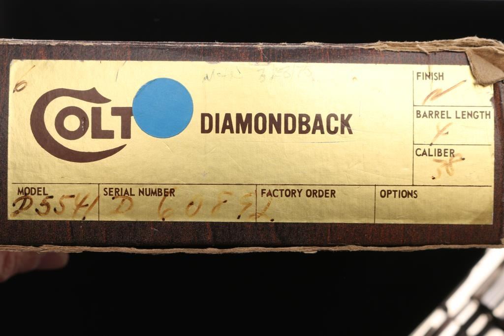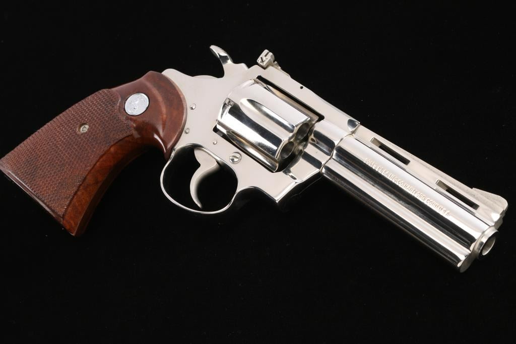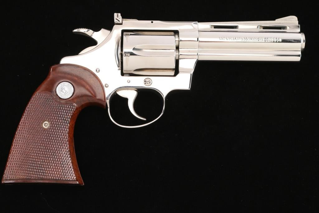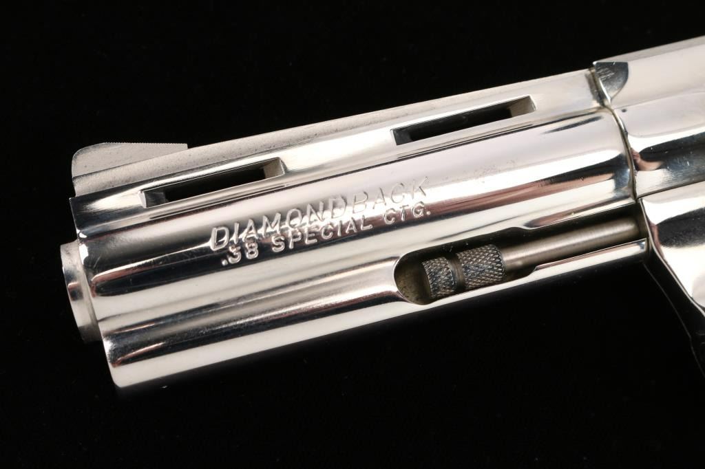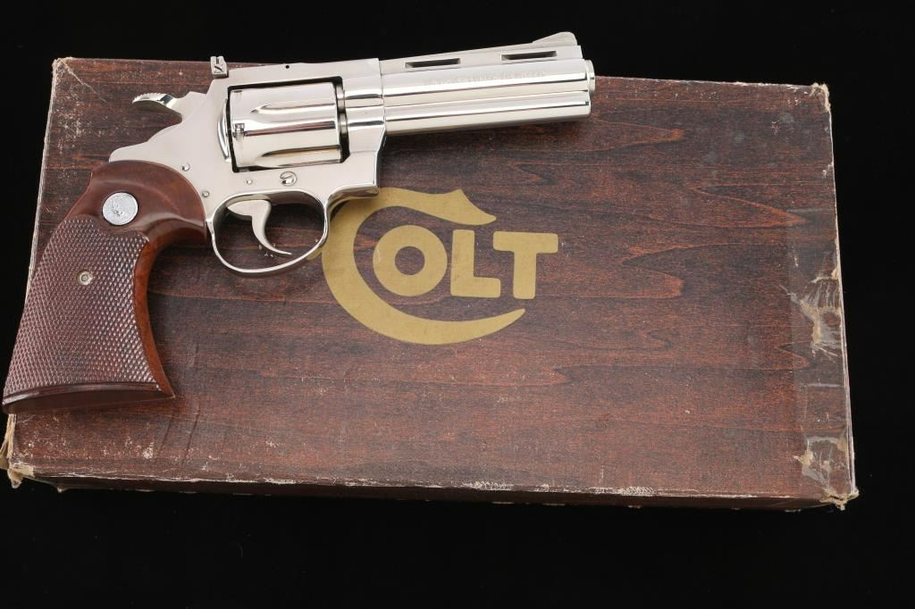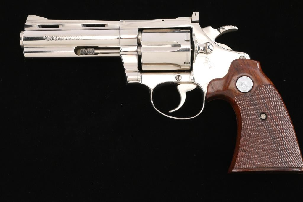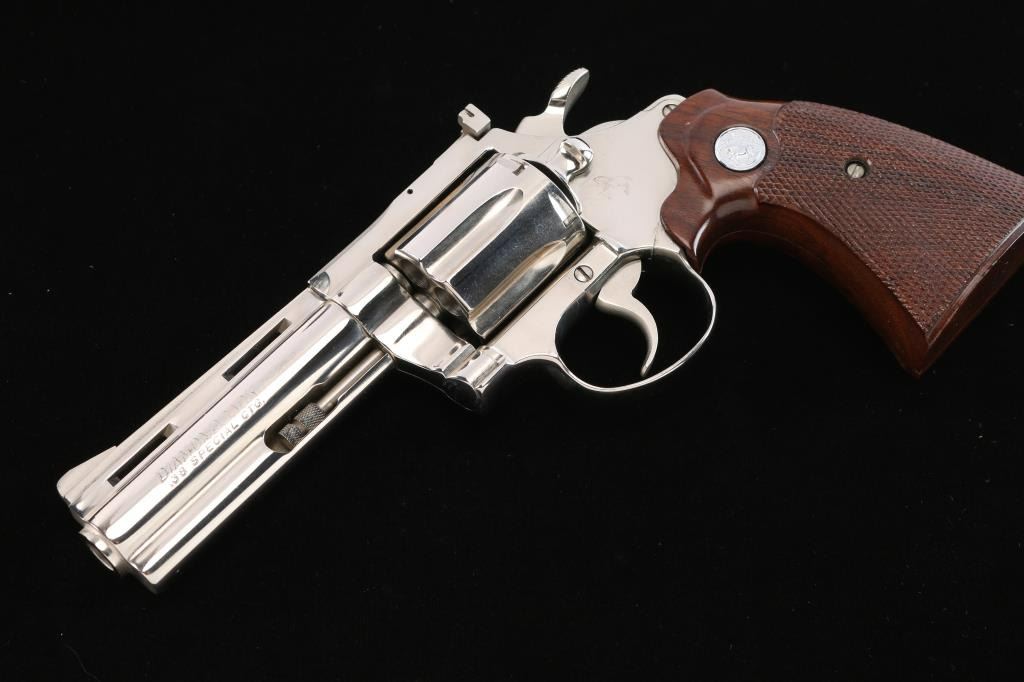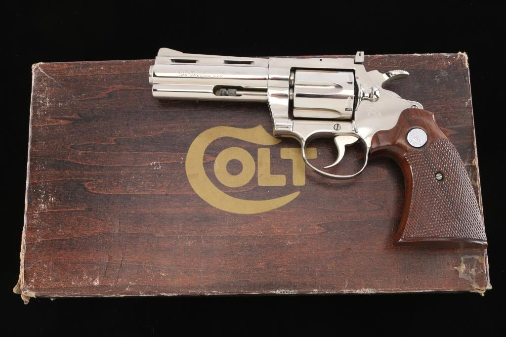 Premium American made small frame double action revolver chambered in 38 Special, manufactured circa 1975, in Hartford, CT. (Mfg. date derived from box). This nickel plated revolver features a 6" vent-ribbed barrel, shrouded ejector rod, full length underlug, knurled ejector rod head, serrated ramped front sight, micrometer adjustable rear sight, long-fluted six-round cylinder, smooth curved trigger, firing pin on hammer nose, serrated hammer spur, built on a 'D' frame, and two-piece checkered hardwood grips with silver-colored Colt medallions. The original nickel finish retained is approximately 99% with only superficial blemishes. Metal displays no rust or deformation. Bore is bright with strong rifling, and the cylinder chambers are also excellent. Grips are excellent with little remarkable. Action is very smooth and crisp with a tight lock-up. Pistol includes original Colt two-piece wood grain cardboard box with matching end label, and manual.