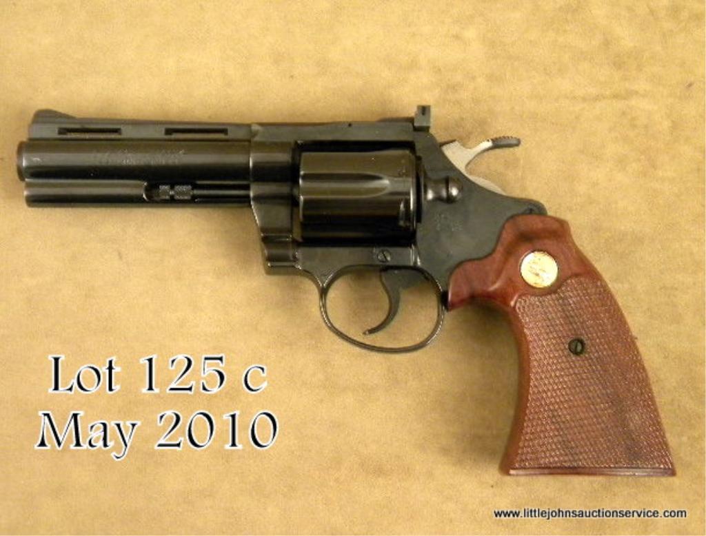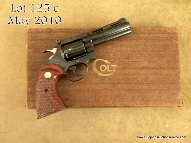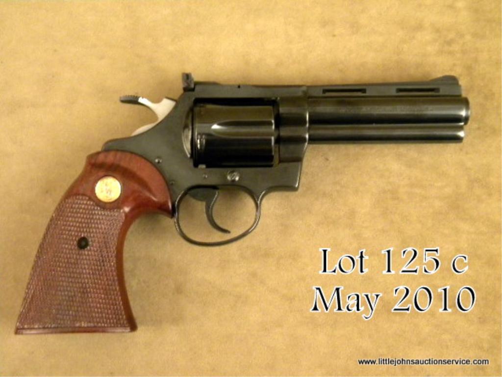 Colt Diamondback DA revolver, .22LR cal., 4” barrel, blue finish, checkered combat wood medallion grips, #R28888. This gun is in overall fine condition showing little use, approx. 99% original blue finish, excellent bore, action,markings and grips accompanied by Colt’s wood grain cardboard box that also is in overall very good condition with just some wear. A very desirable early Diamondback in .22 caliber. Est.: $400-$800.