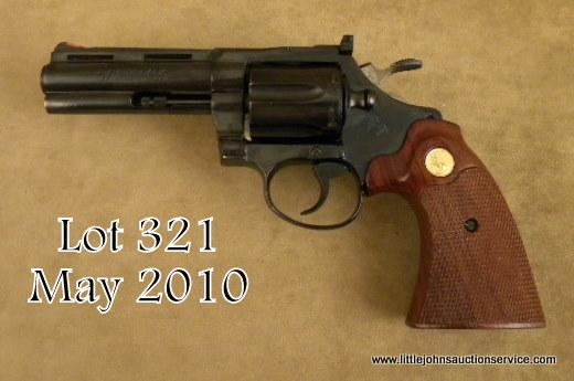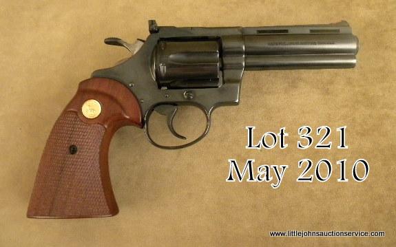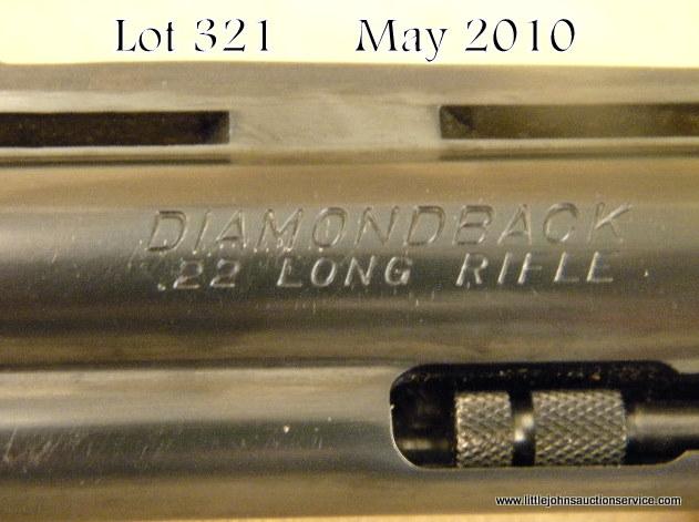 Colt Diamondback Model DA revolver, .22LR cal., 4” ventilated rib barrel, blue finish, checkered gold Colt medallion wood combat style grips, #S67553. This gun is in overall excellent condition showing approx. 98% original blue finish with wear limited to the muzzle; bore should clean to fine, crisp action, sharp markings and excellent grips; the little brother of Colt Python. Est.: $300-$600.