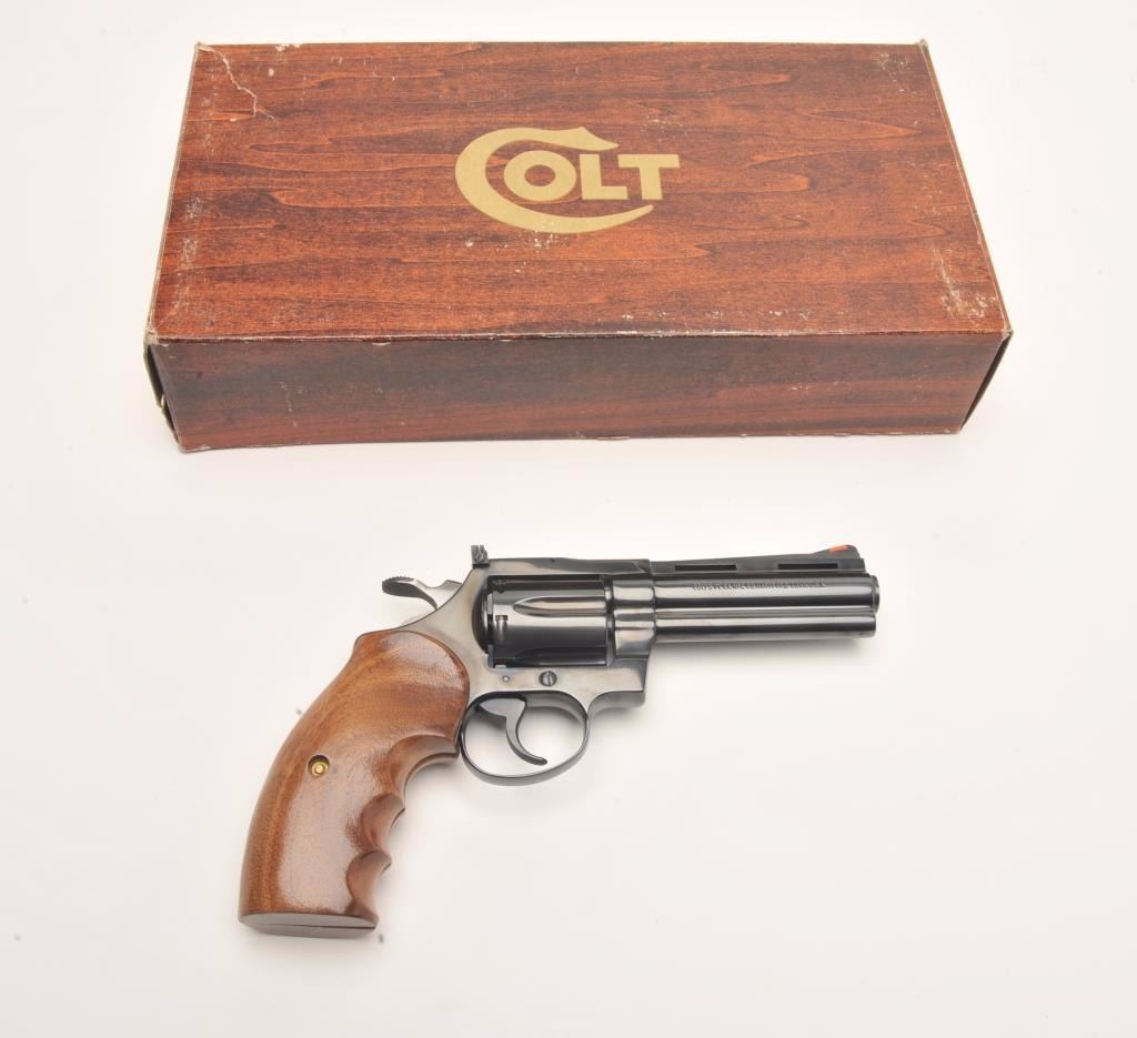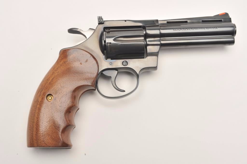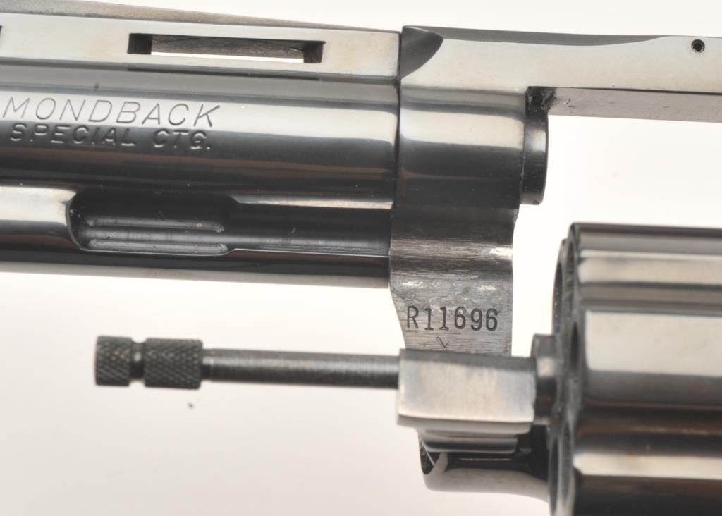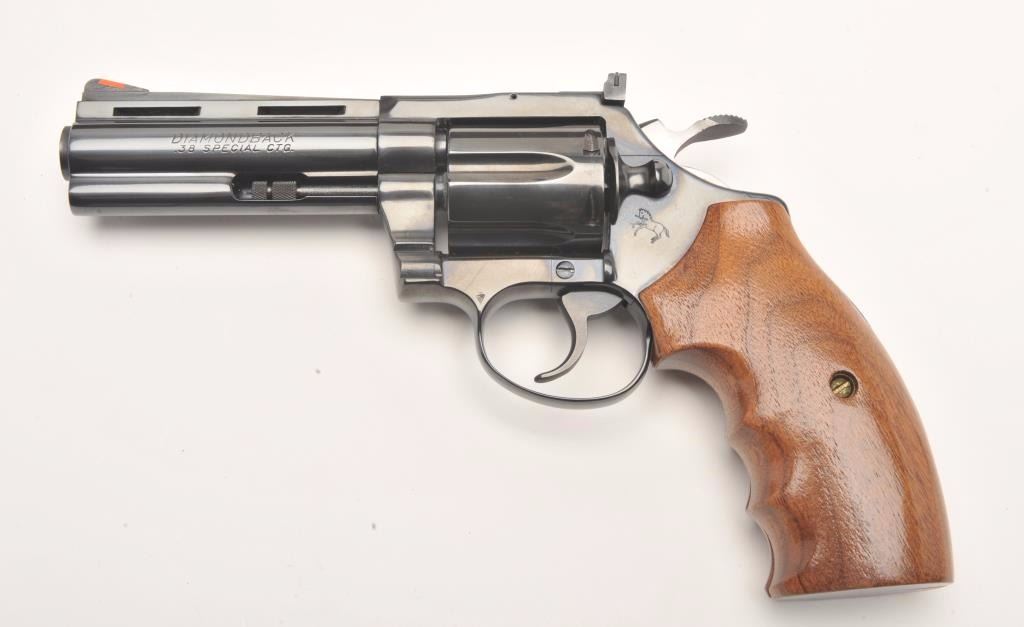 Colt Diamondback Model DA revolver, .38 Special, 4” ventilated rib barrel, blued finish, custom finger groove wood grips, S/N R11696, in overall fine to excellent condition showing slight use and handling;accompanied by factory wood grain cardboard box with inserts and end label numbered to this gun. (Modern/PPT). Est.: $1,000-$1,800.
