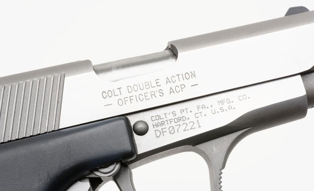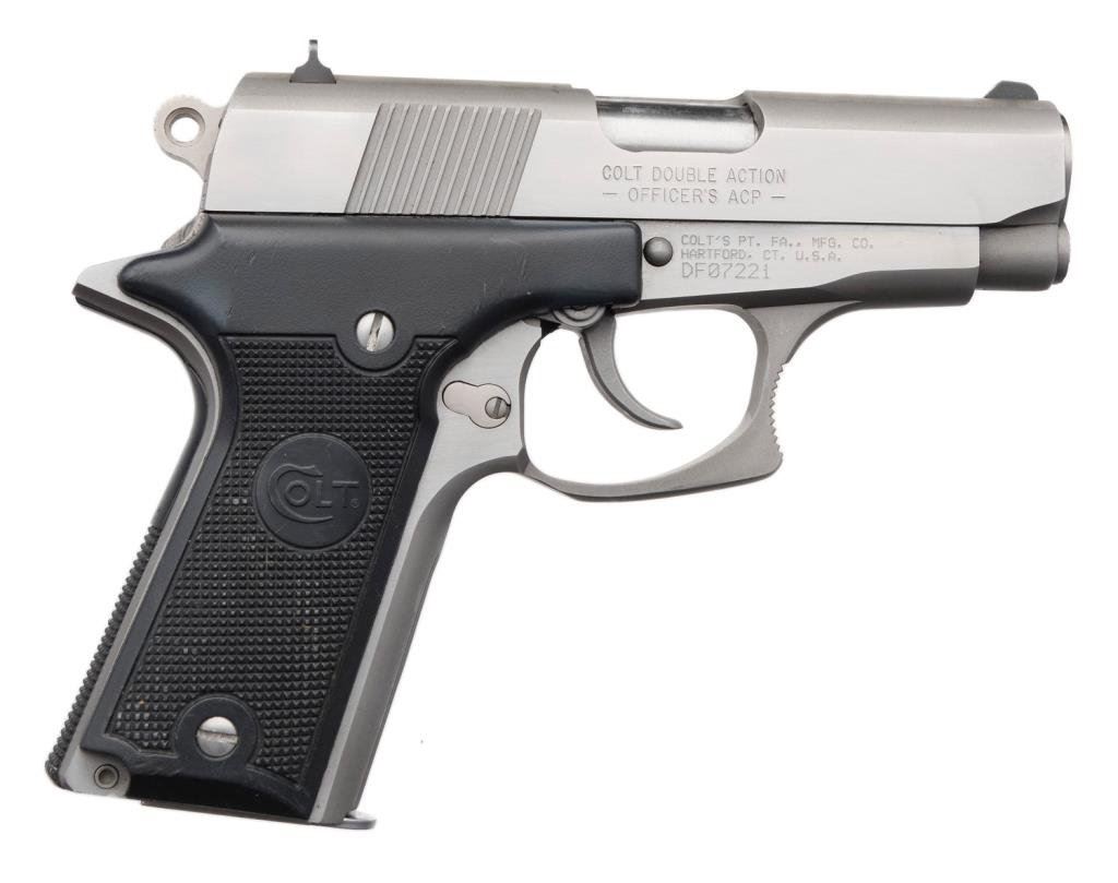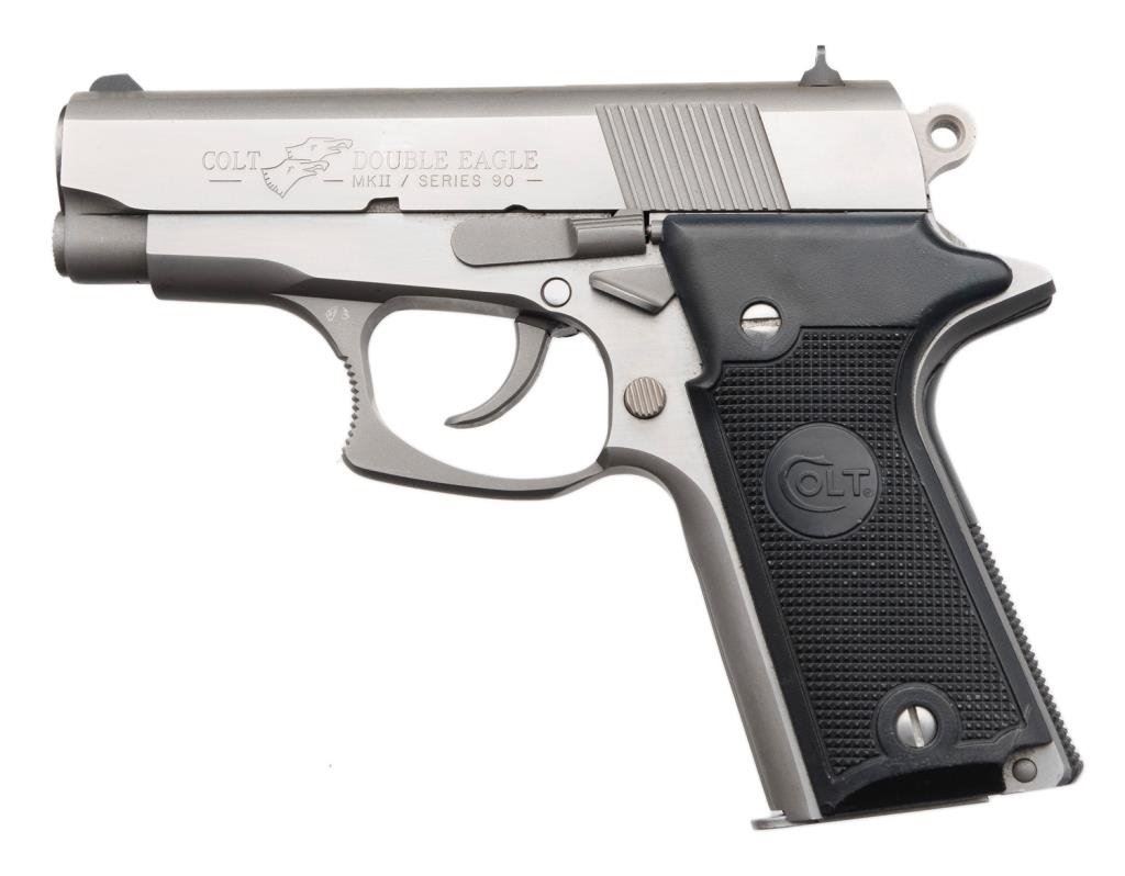 *Colt Double Eagle MK II Series 90 DA semi-automatic pistol, .45 caliber, 3.5” barrel, S/N DF07221, stainless with checkered black grips in fine condition showing minimal use; accompanied by a blue Colt hard carry case and instruction. Est.: $500-$1,000.
