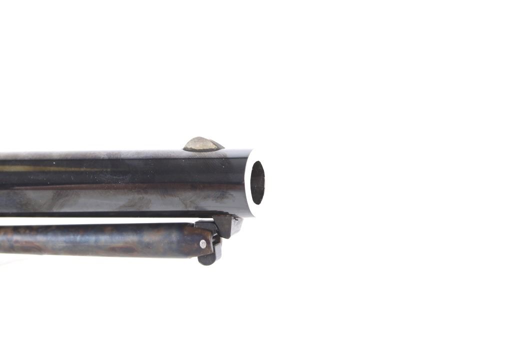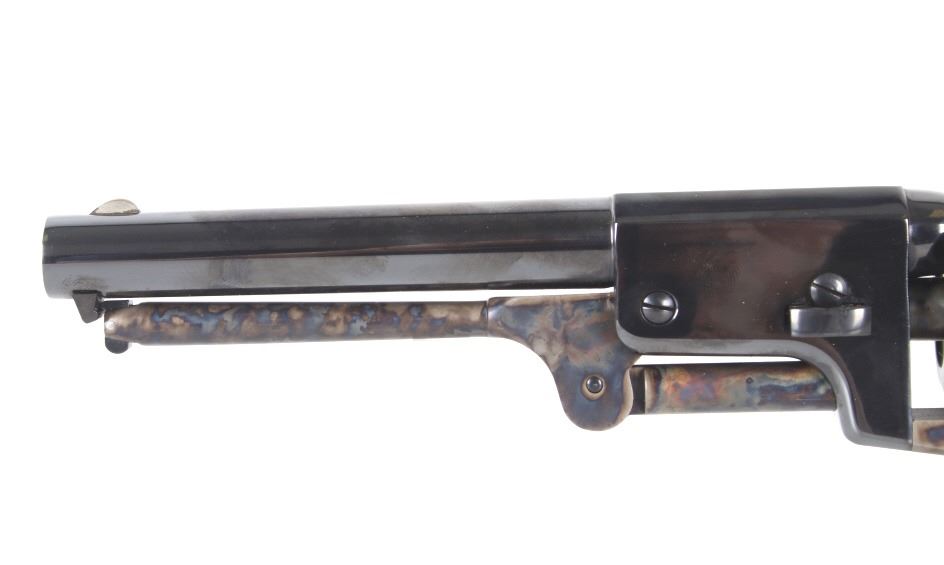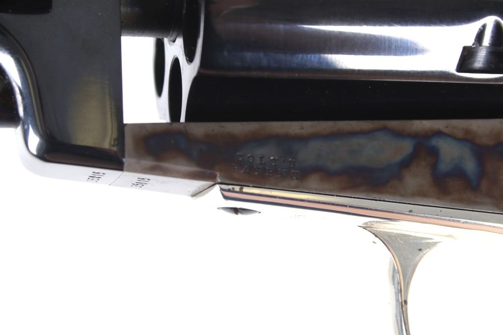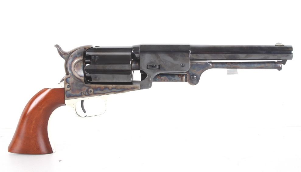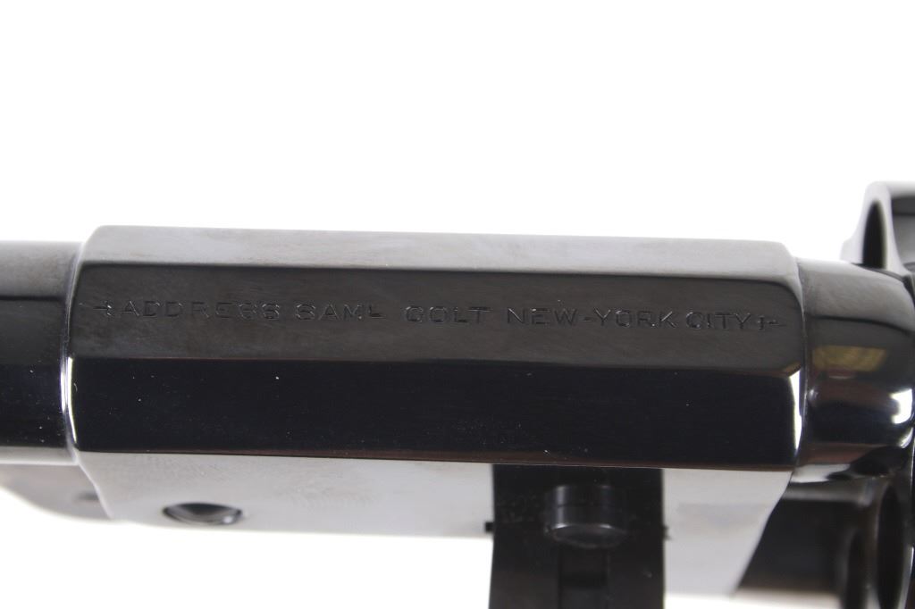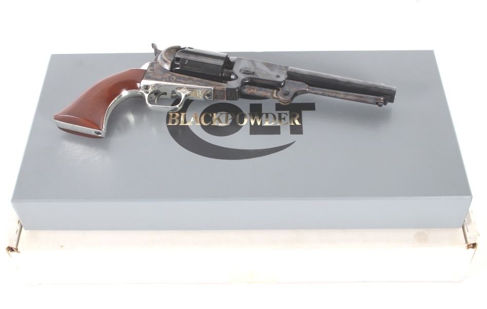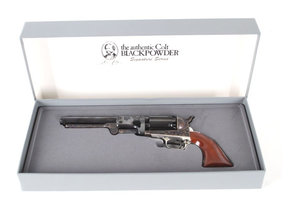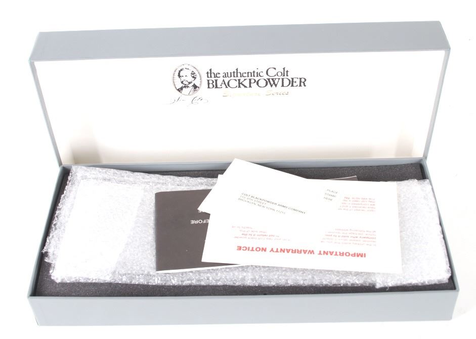Featured in this lot is a Colt Dragoon 3rd Model percussion cap revolver chambered in .44 percussion with its original box. The revolver displays a 7 1/2" long round barrel, fluted six shot cylinder, walnut grips, and blue'd and case hardened finish. This revolver is in the shape of the third model with a serial number of 35915. The pistol is in excellent condition and is possibly a re-make. The top of the barrel is marked "ADDRESS SAML COLT NEW-YORK CITY" with the side of the frame reading "COLT'S PATENT". The revolver comes with its original sales and display box with papers. The revolver shows like new condition with a very tight cylinder and working hammer. Serial Number: 35915. This firearm qualifies as an antique, and does not require FFL Transfer or NICS Background Check.*