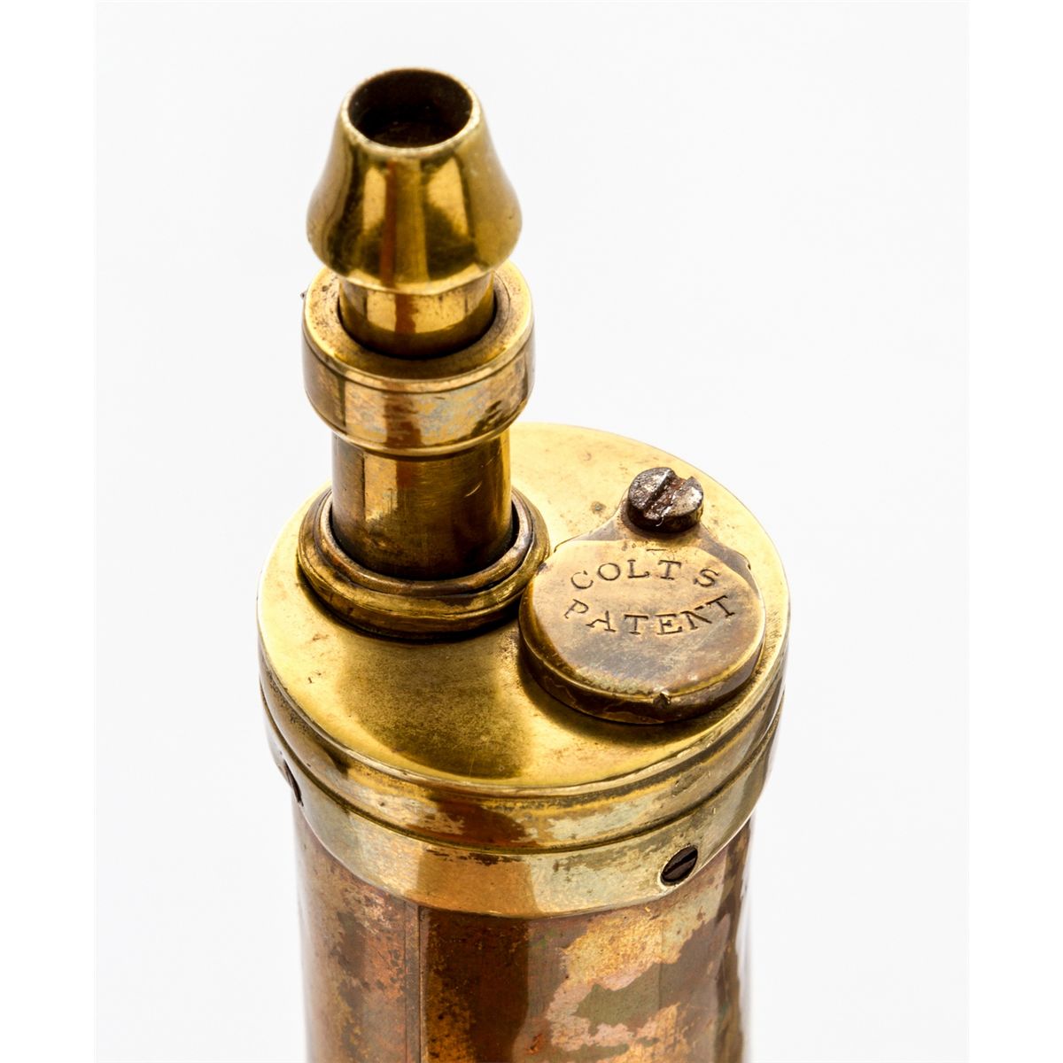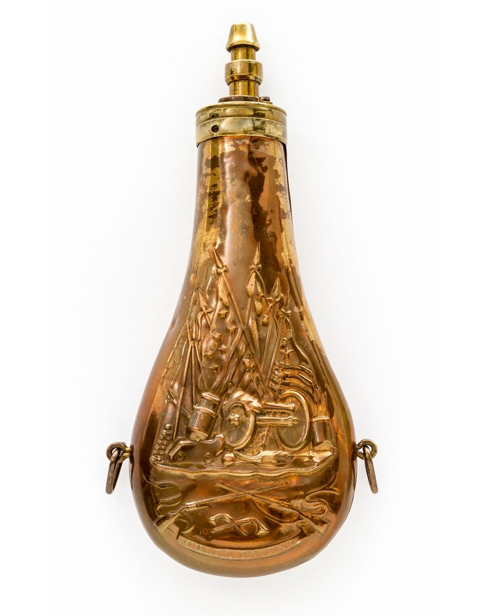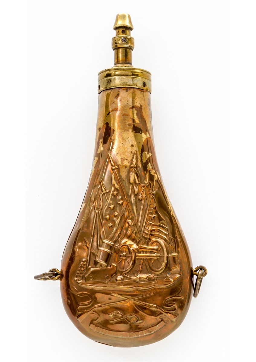 Colt Dragoon Flask, by Dixon & Sons, Sheffield, with cannons, Stand of Arms, crossed rifles and pistols, all above a banner ''Colt's Patent'' to both sides. English flasks were supplied to Colt as early as 1851, this type being correct with all Hartford Dragoons. Similar flask is pictured on page 96 of Colt Accoutrements 1834-1911'', by Rapley, who calls this type out as ''F #34''. Condition is about fine with some replaced screws, minor separation at seams, and losses to varnish. Interior charger details are consistent of those on page 99 of the same publication. Est.: $3,000-$5,000.