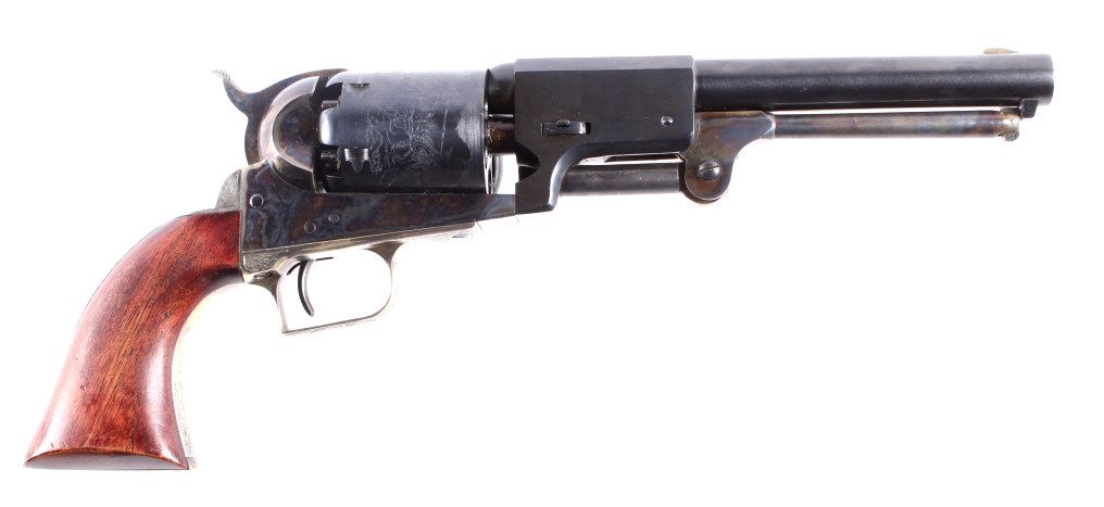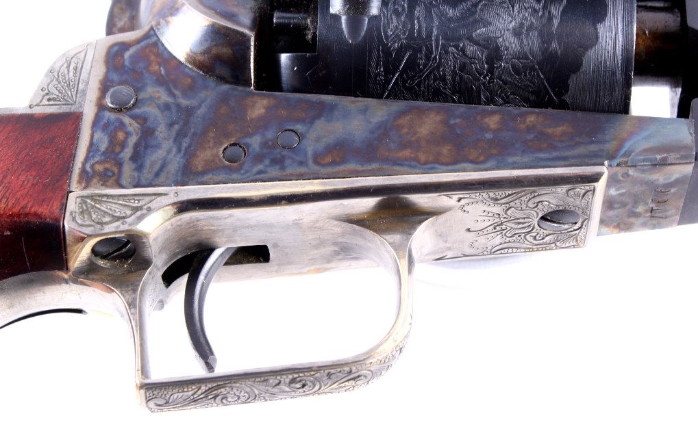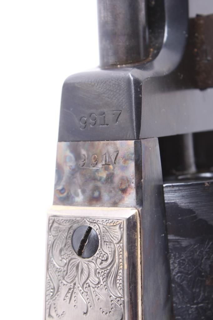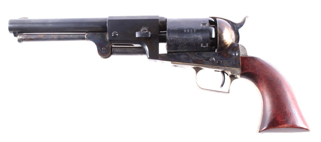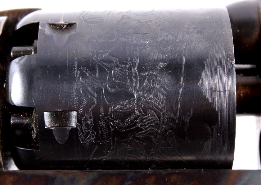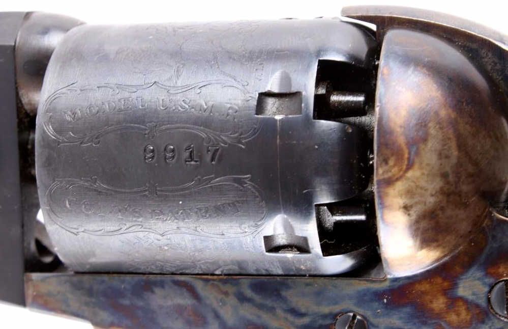 The lot features a Address Saml Colt New York-City .44 caliber Dragoon. The piece is in the shape of the second model with a serial number of 9917 (would be manufactured i 1851). The pistol is in mint excellent condition and is possibly a re-make. This has an engraved cylinder showing an Indian War scene. The trigger guard and grip show engravings with impressive design and the name "J W Hruska". The pistol works flawlessly and near mint condition. Overall measures 13.75" with a 7 7/16" barrel. Barrel marked Model U.S.M.R.