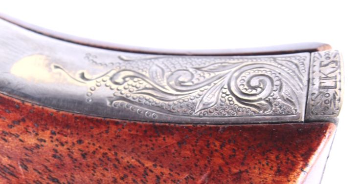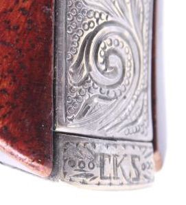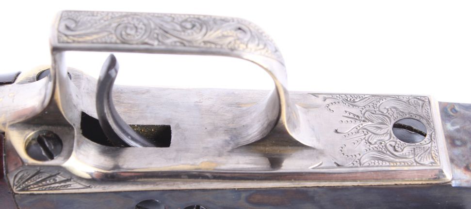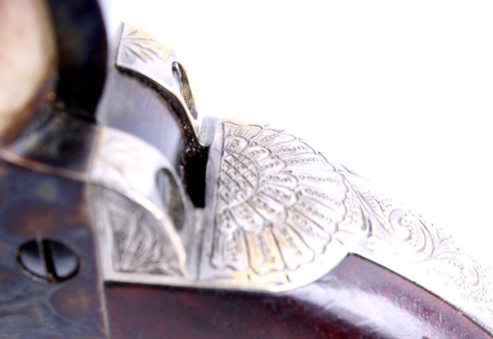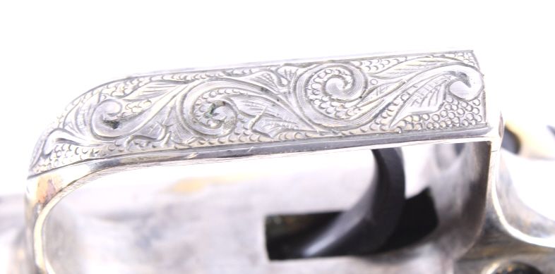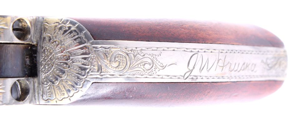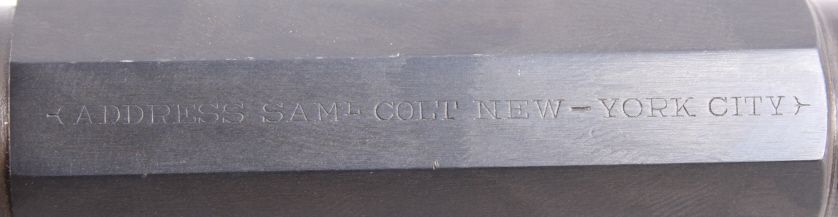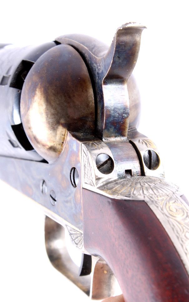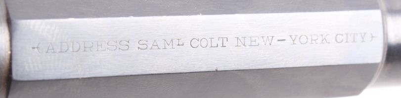 The lot features a Address Saml Colt New York-City .44 caliber Dragoon. The piece is in the shape of the second model with a serial number of 9917 (would be manufactured i 1851). The pistol is in mint excellent condition and is possibly a re-make. This has an engraved cylinder showing an Indian War scene. The trigger guard and grip show engravings with impressive design and the name "J W Hruska". The pistol works flawlessly and near mint condition. Overall measures 13.75" with a 7 7/16" barrel. Barrel marked Model U.S.M.R.
