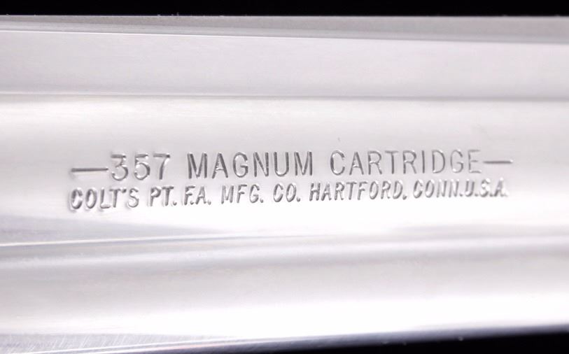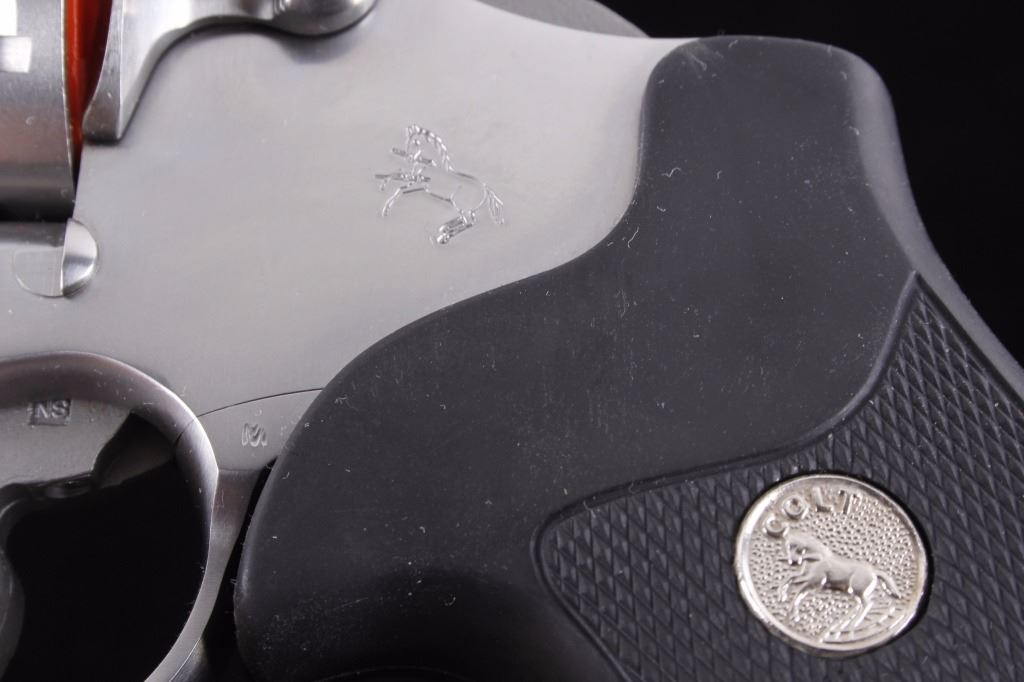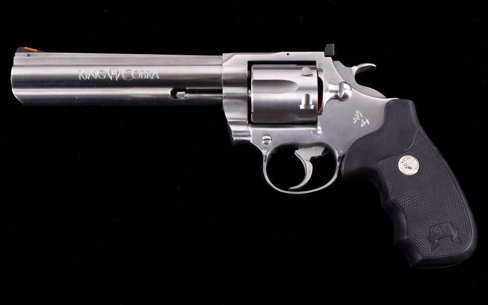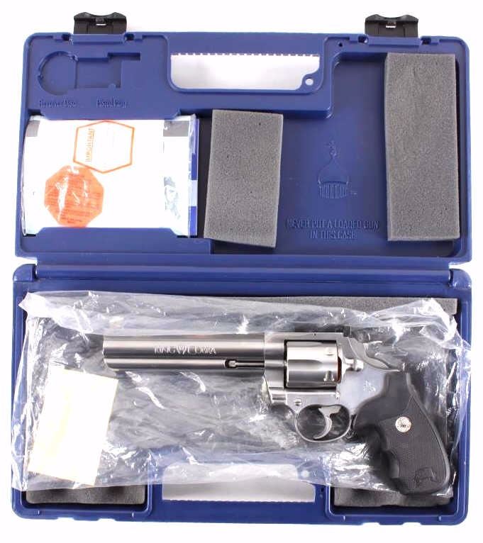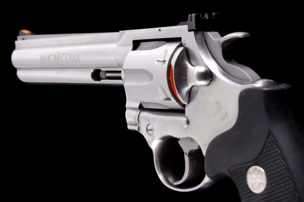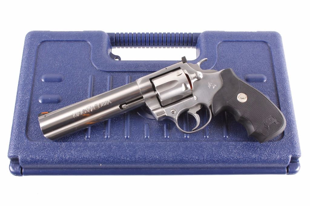 This is a rare last year of production Colt Enhanced King Cobra model double action revolver chambered in .357 Magnum and 38 Special cartridges. The revolver is new in the box and has never been fired. This shows a Stainless Steel Finish with a 6” fully ribbed barrel having a full length barrel underlug. The revolver is called the Enhanced King Cobra as the frame is factory drilled/tapped for a scope mount along with a larger cylinder release and recessed muzzle. This also features a wide serrated target hammer, fully adjustable target sights, and fixed front sight. The pistol shows the factory original black hard rubber finger grooved combat style grips marked Colt with the Colt round medallion inlaid. The revolver comes in the original hard blue Colt case with matching serial number and paperwork. The Colt Model AA3060EDT has a serial number of KU3955 and was manufactured in 1998. In 1986 Colt upgraded the Colt Trooper Mark V in stainless, renaming it the King Cobra, in response to the huge popularity of the Colt Python. The King Cobra was marked with the Cobra Head logo, breaking the tradition of having only the name and caliber on the barrel. The King Cobra was discontinued in 1998 with this possibly being one of the last Enhanced King Cobra model revolvers manufactured, RARE. Modern Handgun requires FFL Transfer or NICS Background check. Marked on left side, “KING (cobra head) COBRA – VP (in triangle) – M - (Colt’s Prancing Pony logo).” Marked on right side, “-357 MAGNUM CARTRIDGE- COLT’S PT. F.A. MFG. CO. HARTFORD. CONN. U.S.A.”