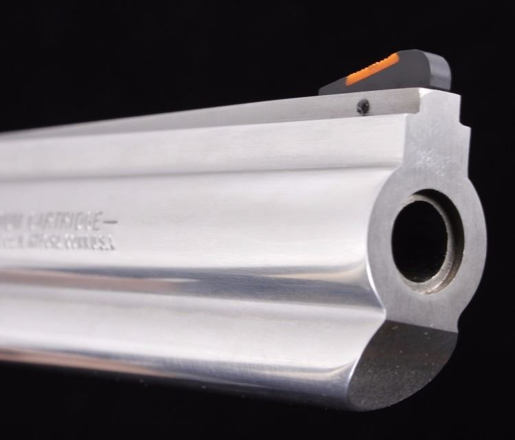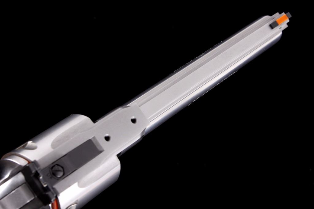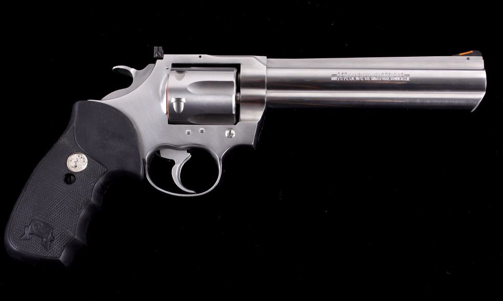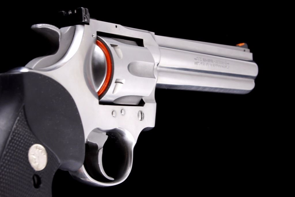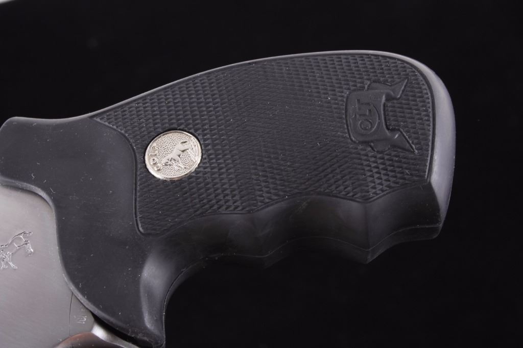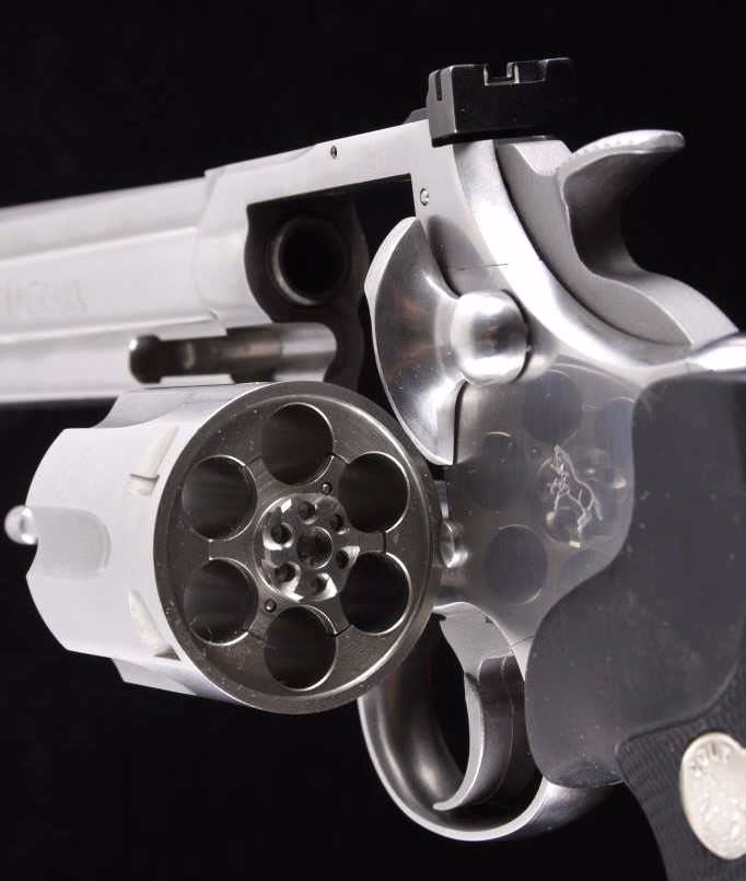 This is a rare last year of production Colt Enhanced King Cobra model double action revolver chambered in .357 Magnum and 38 Special cartridges. The revolver is new in the box and has never been fired. This shows a Stainless Steel Finish with a 6” fully ribbed barrel having a full length barrel underlug. The revolver is called the Enhanced King Cobra as the frame is factory drilled/tapped for a scope mount along with a larger cylinder release and recessed muzzle. This also features a wide serrated target hammer, fully adjustable target sights, and fixed front sight. The pistol shows the factory original black hard rubber finger grooved combat style grips marked Colt with the Colt round medallion inlaid. The revolver comes in the original hard blue Colt case with matching serial number and paperwork. The Colt Model AA3060EDT has a serial number of KU3955 and was manufactured in 1998. In 1986 Colt upgraded the Colt Trooper Mark V in stainless, renaming it the King Cobra, in response to the huge popularity of the Colt Python. The King Cobra was marked with the Cobra Head logo, breaking the tradition of having only the name and caliber on the barrel. The King Cobra was discontinued in 1998 with this possibly being one of the last Enhanced King Cobra model revolvers manufactured, RARE. Modern Handgun requires FFL Transfer or NICS Background check. Marked on left side, “KING (cobra head) COBRA – VP (in triangle) – M - (Colt’s Prancing Pony logo).” Marked on right side, “-357 MAGNUM CARTRIDGE- COLT’S PT. F.A. MFG. CO. HARTFORD. CONN. U.S.A.”