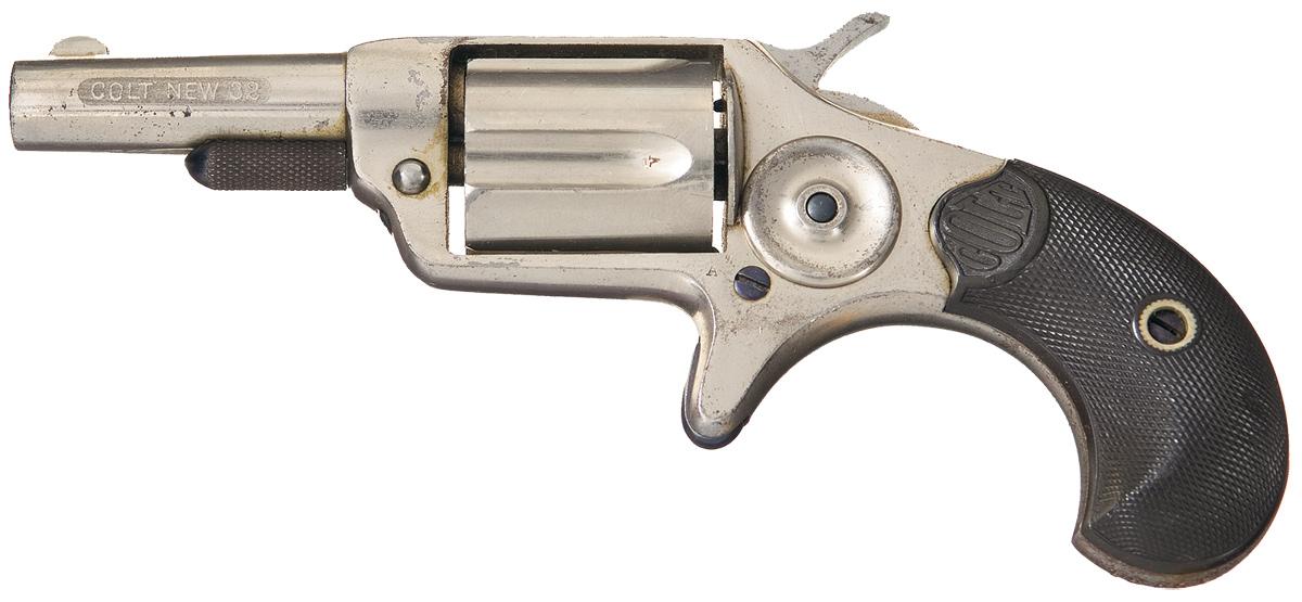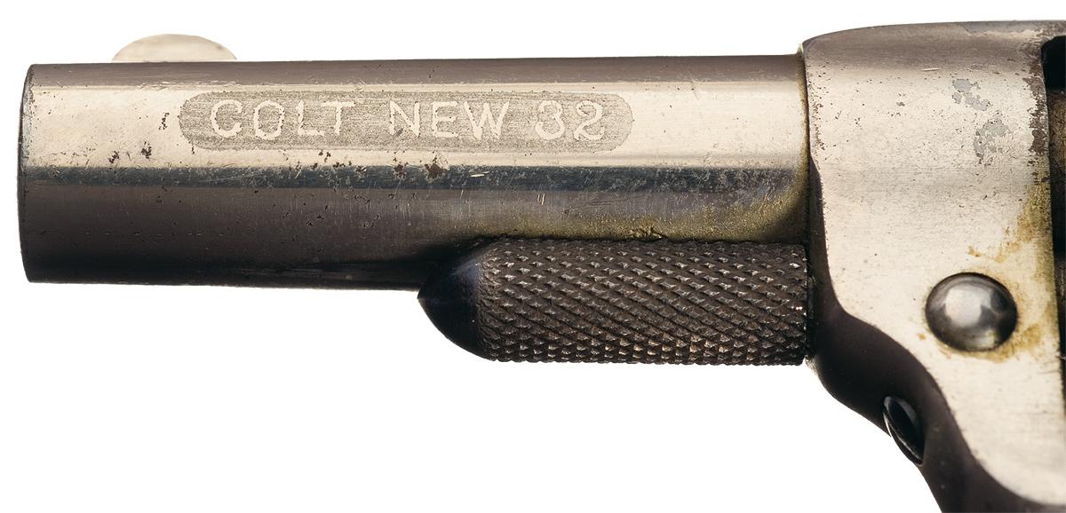 Manufactured in 1882. Standard two line Hartford barrel address without Maltese crosses on top of the barrel and etched "COLT NEW 32" on the left side. The serial number is marked on the butt. Nickel finish with niter blue hammer top, trigger, cylinder pin and screws, and fitted with checkered hard rubber grips with "COLT" at the top.