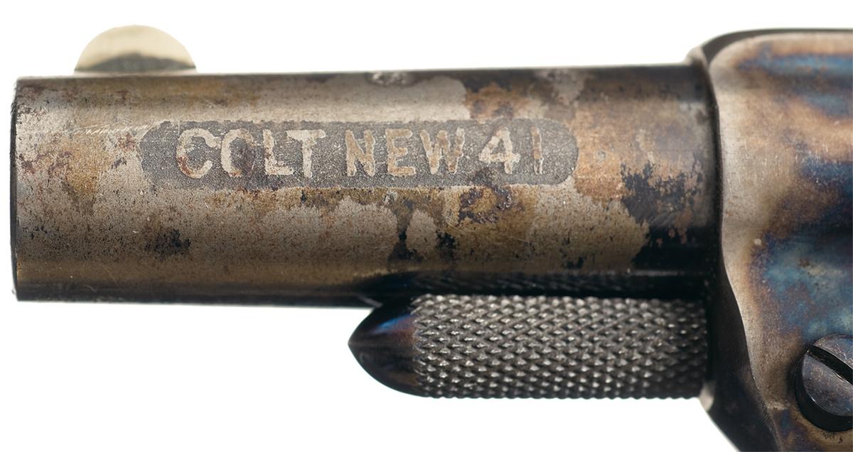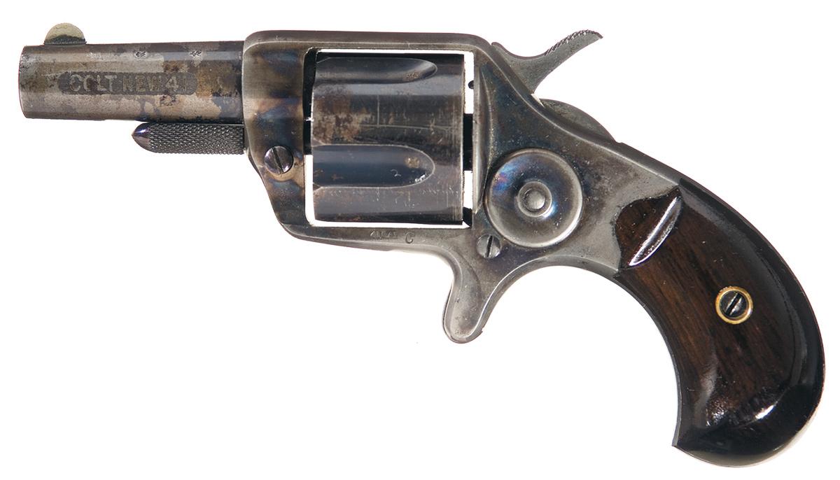 Manufactured in 1877, later passing through the Proofhouse at Birmingham. Fixed sights, with the two line address on top of the barrel, acid etched "COLT NEW 41" panel on the left side and patent marks ahead of the cylinder pin cutout. Marked "41 CAL C" on the left side of the frame, with a niter blue loading gate, hammer and trigger and an extra long knurled cylinder pin. The upper left side of the barrel is stamped with a pair of crossed scepter proofs, repeated in the cylinder flues. Smooth birds head grips.