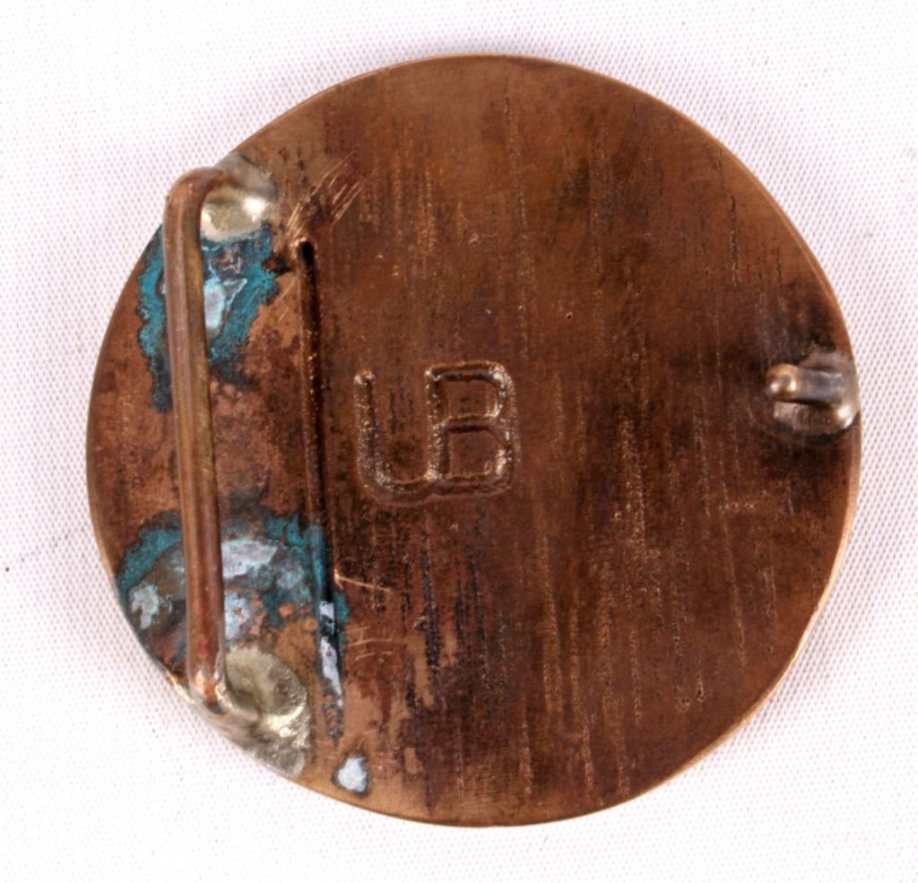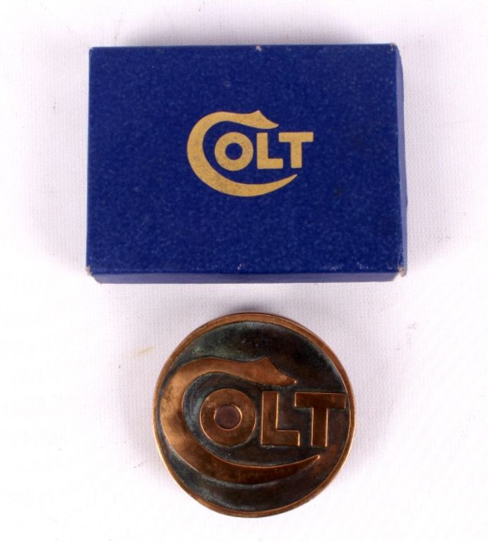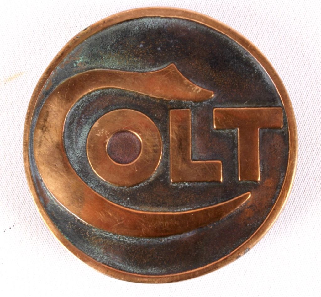 This lot features a Colt Firearms belt buckle. Made of solid copper, it shows great patina. This buckle measures 2.5" in dameter.