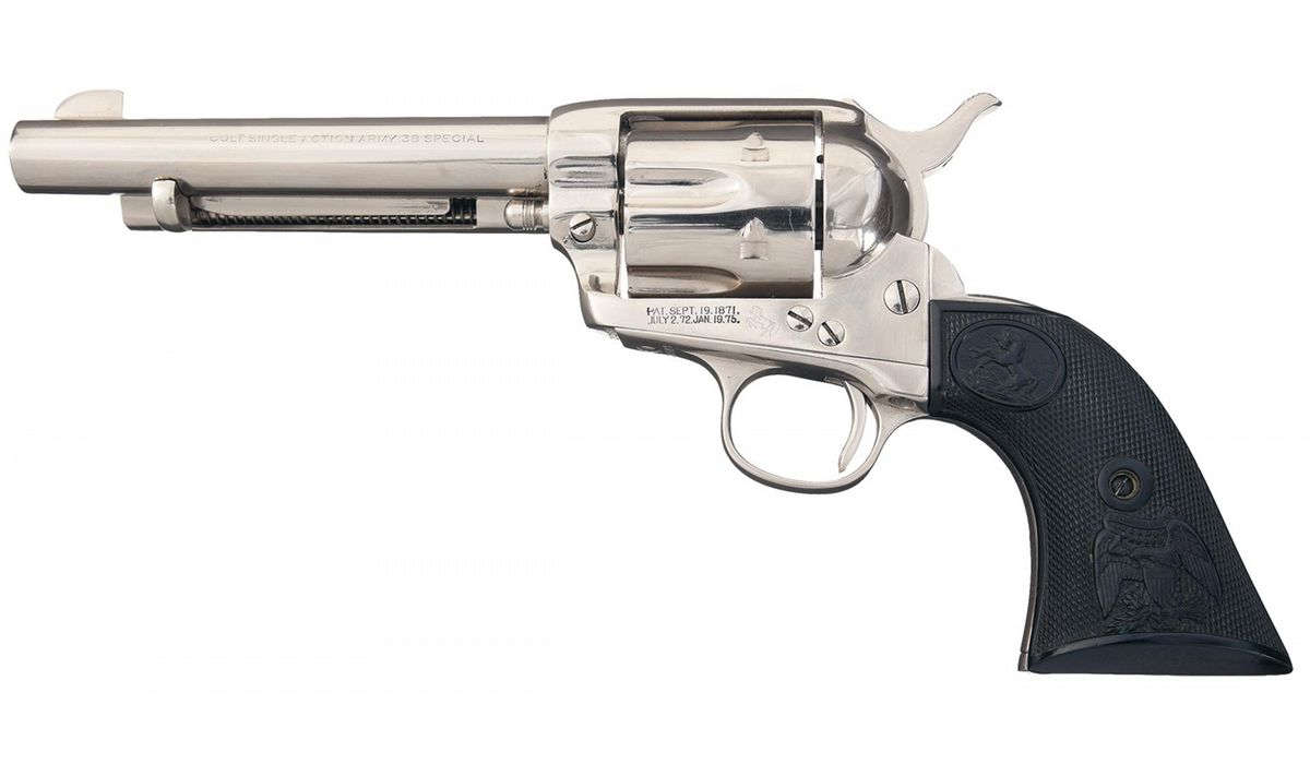 Manufactured in 1903. Blade and groove sights with the one line Hartford address on top of the barrel and "COLT SINGLE ACTION ARMY .38 SPECIAL." on the left, two line, three date patent marking on the left side of the frame followed by the Rampant Colt "3584" assembly number on the loading gate and matching numbers on the frame, trigger guard and back strap. Fitted with modern checkered Rampant Colt/American Eagle relief grips.