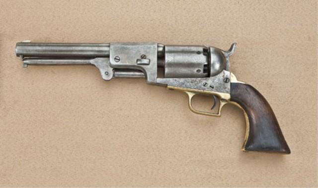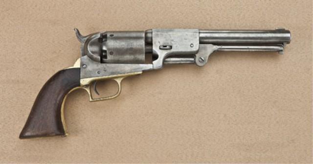 Colt First Model Dragoon, .44 caliber percussion, early US martially marked. Pre “fluck”, serial #1929. The barrel has been heavily cleaned and edges are somewhat rounded. Serial number other than “1” not legible on barrel. The barrel shows short lug, and correct address, which is fully legible. The ramrod is correct early type and matches the assembly number on bottom of barrel, which is correct to this period, and the ramrod is early type with a bulbous end, showing a replaced latch and catch. The cylinder shows some faint traces of scene. The number is visible. The cylinder has been cleaned also and shows some pitting and erosion. The frame shows good Colt’s patent and US marked almost at the center, which is correct for early Dragoons, and the frame also has been cleaned on the right side and recoil shields show some light to heavy pitting where not cleaned. The hammer shows some heavy pitting that has been cleaned. The backstrap and triggerguard show aggressive cleaning long ago and now are aging back. The grips are early slimjim type and are well worn with some dings and mars and are only fair to good. The mainspring is weak or broken, the action is working, the barrel is loose