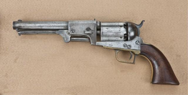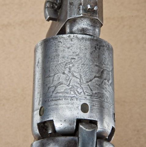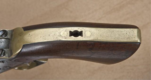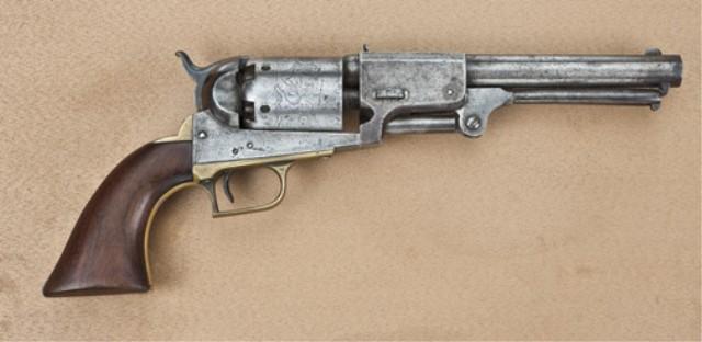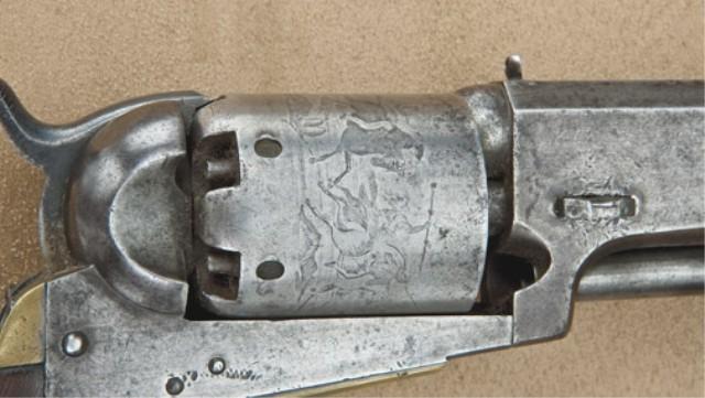 Colt First Model Dragoon, .44 caliber percussion revolver, blue finish, wood grips, U.S. marked frame, serial #5447. The dragoon shows traces of original blue on barrel drifting to a grey brown patina, some scattered light to moderate erosion and pinprick pitting, the pitting occurring at the muzzle and forcing cone. The barrel address is sharp. There has been a well made v-notch sight added at the breech through the “ad” in address. There has also been a fine silver sideplate added at the front of the barrel which is matching to this period rear sight. The cylinder shows approx. 75-85% well-defined cylinder scene with most of Dragoon’s and Colt’s patent along with Ornsby signature visible. The Dragoon and Indian scene is very sharp and still crisp. The cylinder shows a light grey patina. The hammer shows traces of case hardening gone to a dark patina. The frame shows a light grey to brown patina with some very faint colors mixed in. The backstrap and trigger gua show traces of darkened old silver plate in protected areas. The grips are good with a couple small losses at the edges and toes, a few marks on the butt, but generally good overall. The backstrap shows a well-milled cut for a key type